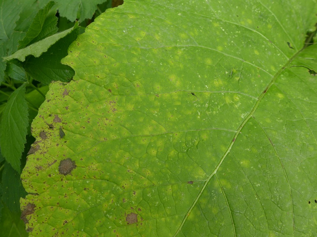 Befall blattoberseits durch jung gelbgrüne, später dunkle Fleckenbildung zu erkennen