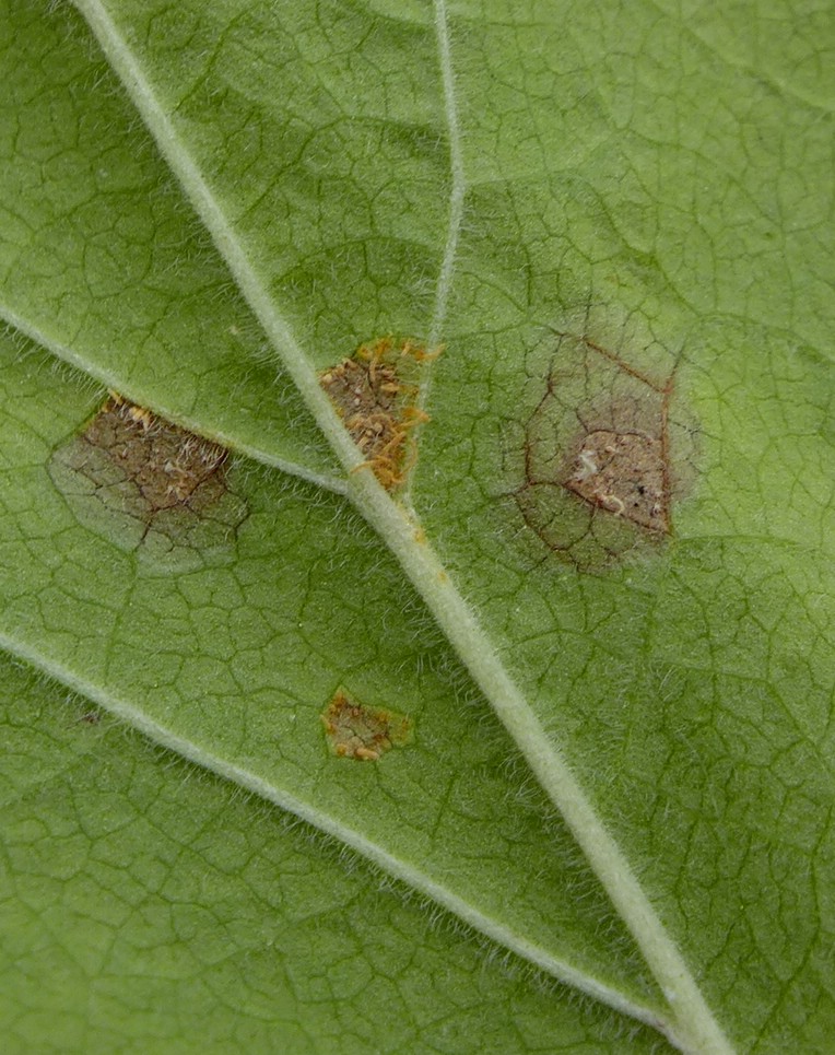 Befallene Blattstellen sind oberseits gelblich verfärbt