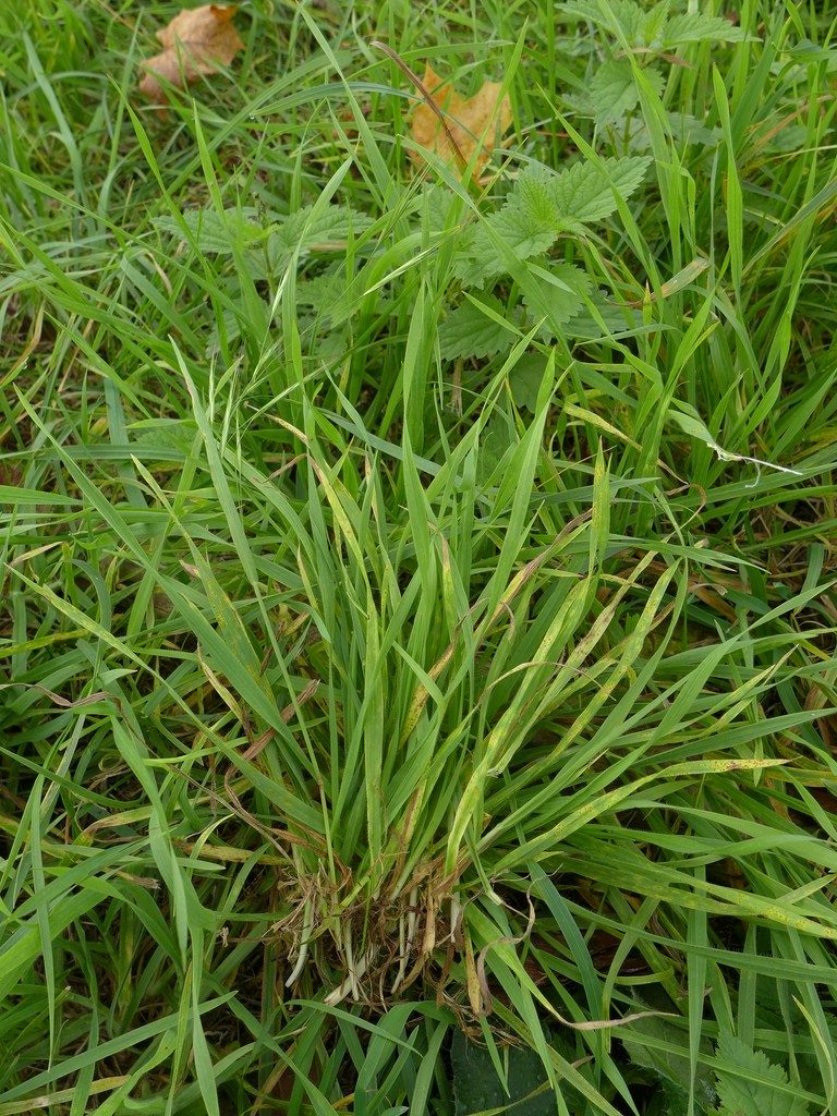 Pilzlager auf beiden Blattseiten von gelben, rötlichen oder braunen länglichen und zahlreichen Blattflecken