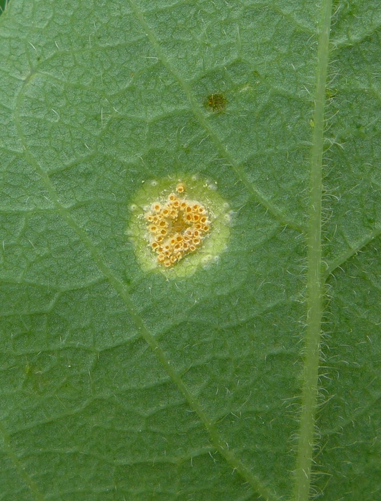 Aezien in meist kleinen ringförmig angeordneten Gruppen auf der Unterseite von kleinen runden, gelblichen Blattflecken