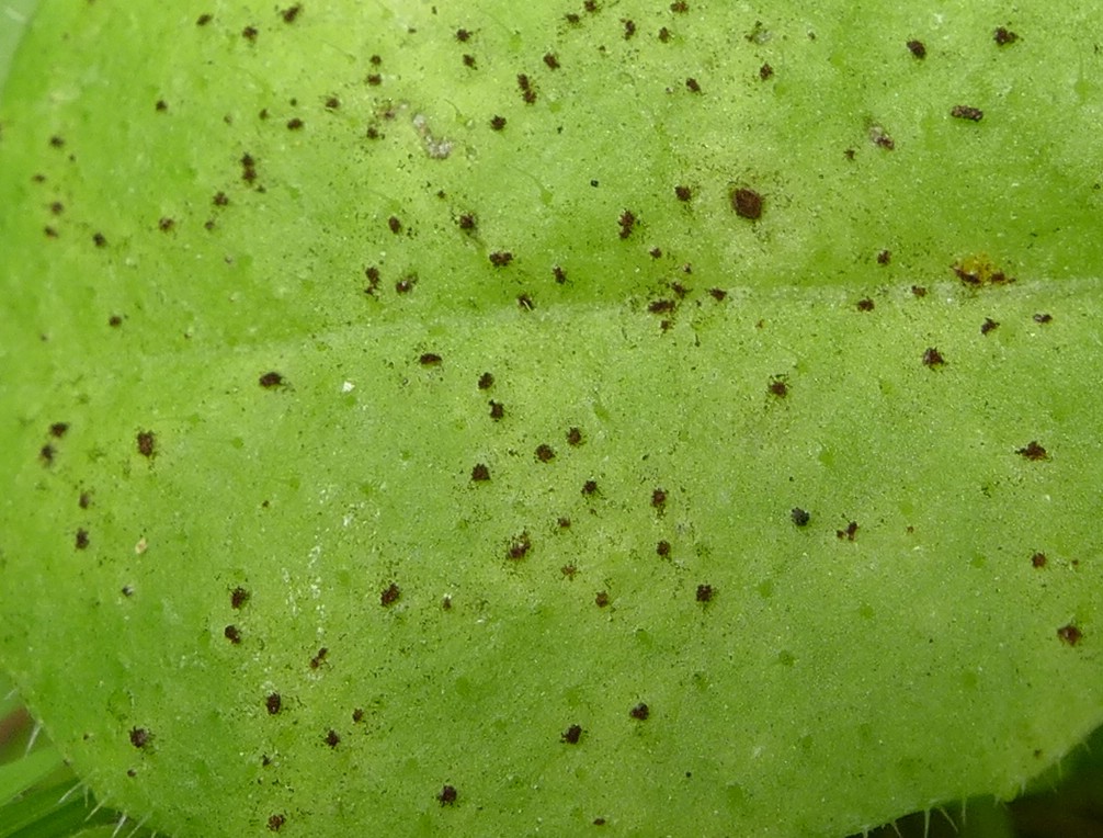 Die Art bildet große primäre Uredien und sekundäre kleinere Uredien aus; hier auf den Blättern sind die primären Uredien zu sehen
