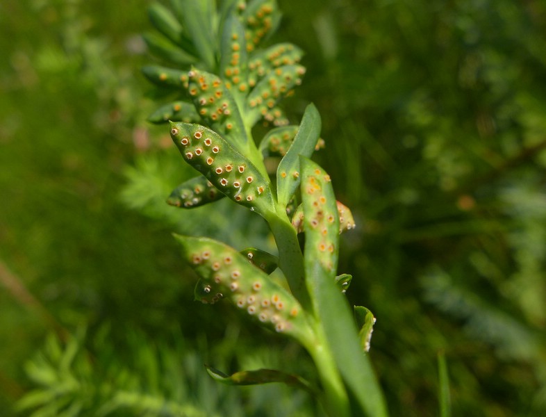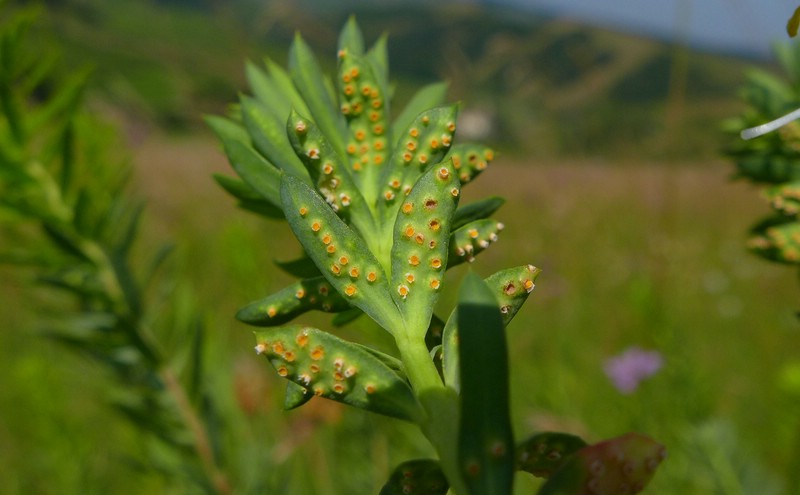 Bemerkung: Dieser Rostpilz vollführt einen Wirtswechsel. Die becherförmigen Aezien werden auf Steppen-Wolfsmilch (Euphorbia seguieriana) gebildet. Hingegen der Literatur sind diese aber nicht weiß, sondern wie bei Aecidium euphorbiae orange gefärbt. Im Sommer wechselt der Pilz auf verschiedene Vertreter der Nelkengewächse (Caryophyllaceae) um dort seine Entwicklung mit der Ausbildung von Uredien (II) und Telien (III) zu vollenden.