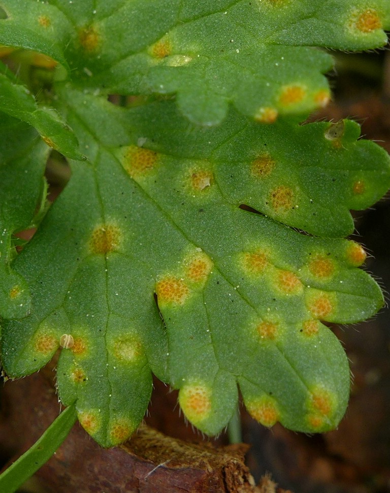 Blattoberseits äußert sich der Befall durch gelbliche bis orange Flecken, in den die rundlichen Spermogonien gebildet werden