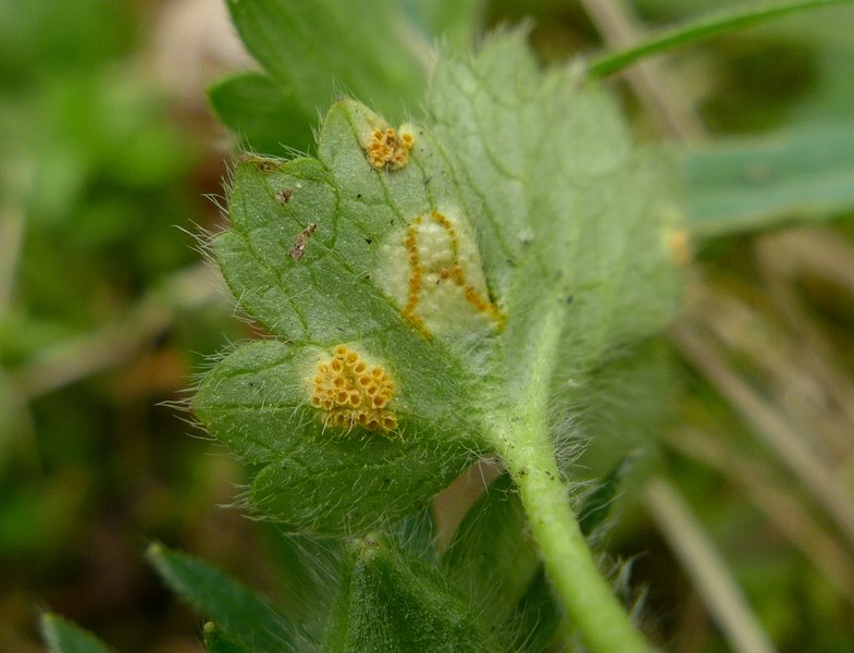 Bemerkung: Dieser Rostpilz vollführt einen Wirtswechsel. Es handelt sich hierbei um eine Artengruppe, welche bei Funden von becherförmigen Aezien auf Hahnenfuß Anwendung findet. Die genaue Art kann nur über die Kenntniss des Wirtswechselpartners und eine intensive mikroskopische Analyse bestimmt werden. Während auf verschiedenen Hahnenfußarten die Spermogonien und Aezien gebildet werden, wechselt der Pilz im Sommer auf verschiedene Vertreter der Süßgräser (Poaceae) um dort seine Entwicklung mit der Ausbildung von Uredien und Telien zu vollenden.