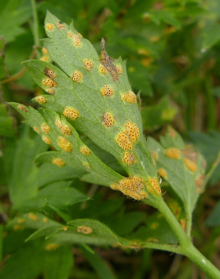 Bemerkung: Dieser Rostpilz vollführt einen Wirtswechsel. Es handelt sich hierbei um eine Artengruppe, welche bei Funden von becherförmigen Aezien auf Hahnenfuß Anwendung findet. Die genaue Art kann nur über die Kenntniss des Wirtswechselpartners und eine intensive mikroskopische Analyse bestimmt werden. Während auf verschiedenen Hahnenfußarten die Spermogonien und Aezien gebildet werden, wechselt der Pilz im Sommer auf verschiedene Vertreter der Süßgräser (Poaceae) um dort seine Entwicklung mit der Ausbildung von Uredien und Telien zu vollenden.