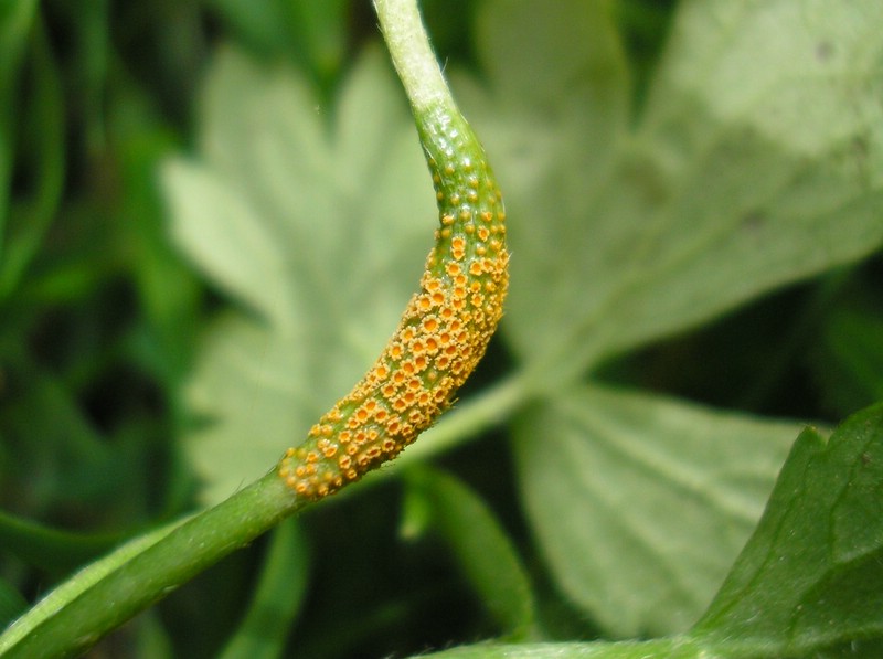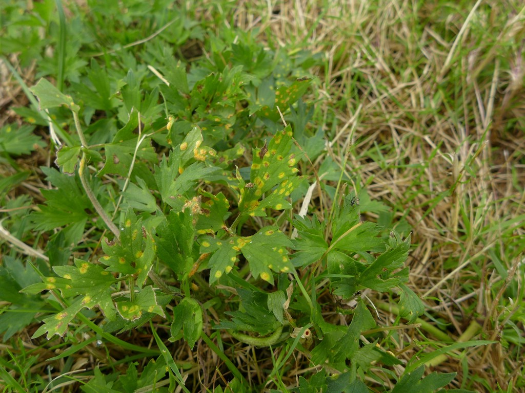 Bemerkung: Dieser Rostpilz vollführt einen Wirtswechsel. Es handelt sich hierbei um eine Artengruppe, welche bei Funden von becherförmigen Aezien auf Hahnenfuß Anwendung findet. Die genaue Art kann nur über die Kenntniss des Wirtswechselpartners und eine intensive mikroskopische Analyse bestimmt werden. Während auf verschiedenen Hahnenfußarten die Spermogonien und Aezien gebildet werden, wechselt der Pilz im Sommer auf verschiedene Vertreter der Süßgräser (Poaceae) um dort seine Entwicklung mit der Ausbildung von Uredien und Telien zu vollenden.