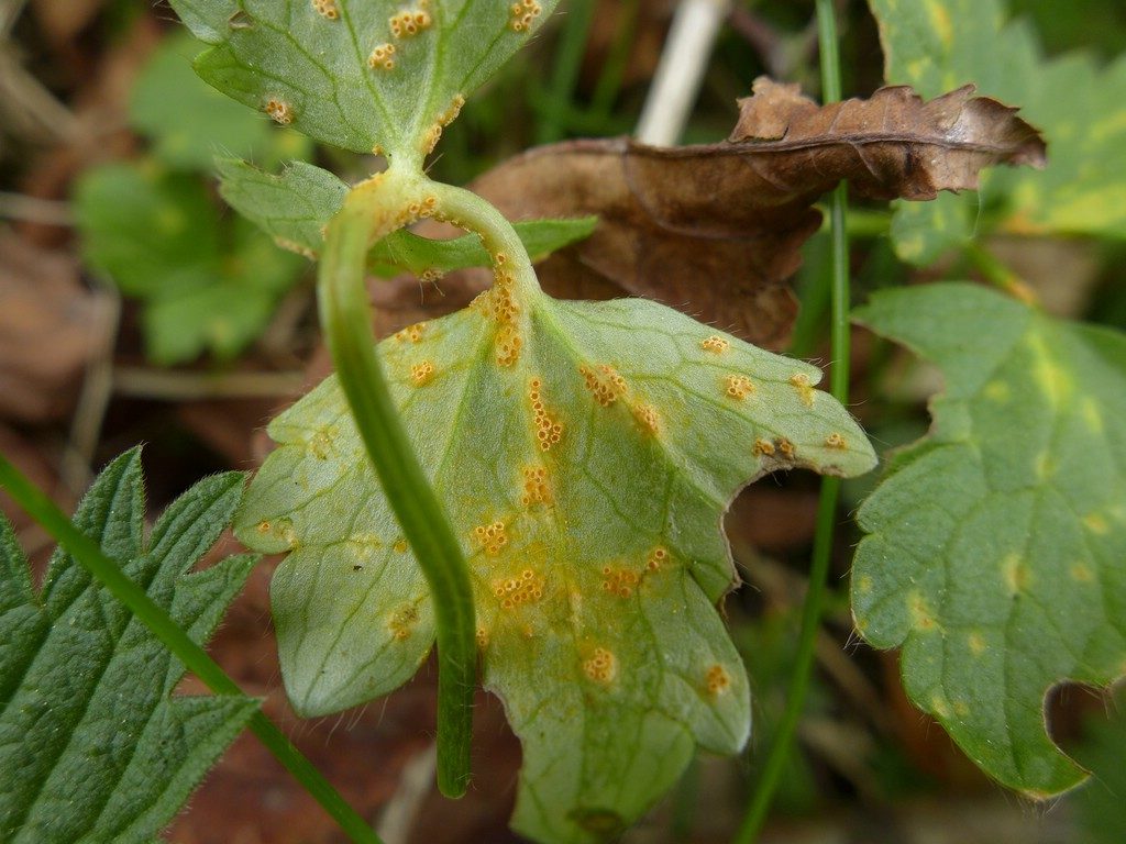 Blattoberseits äußert sich der Befall durch gelbliche bis orange Flecken, in den die rundlichen Spermogonien gebildet werden