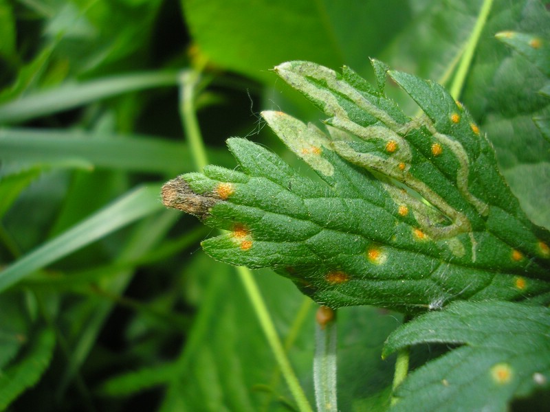 Blattoberseits äußert sich der Befall durch gelbliche bis orange Flecken, in den die rundlichen Spermogonien gebildet werden