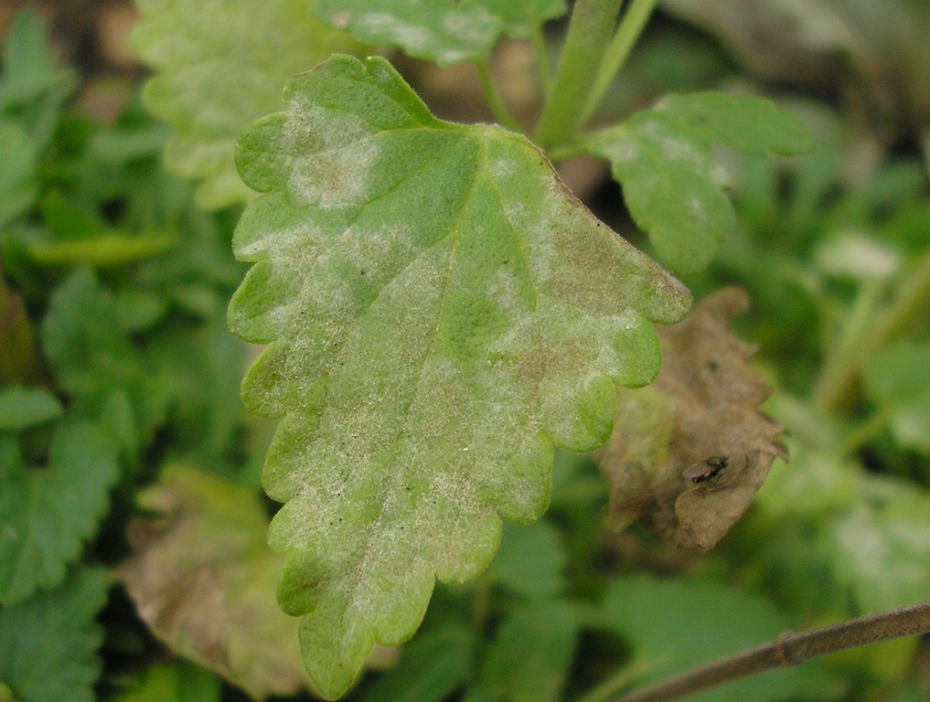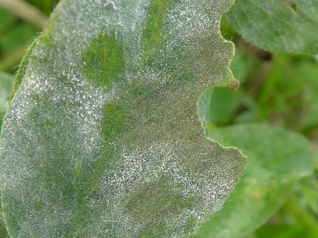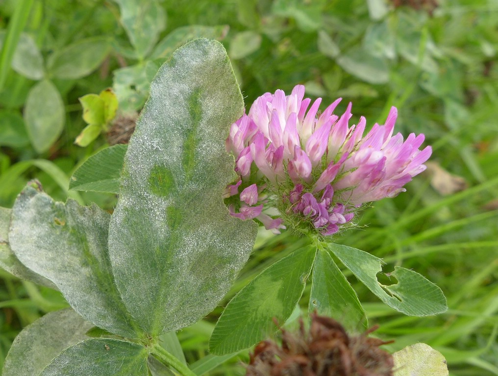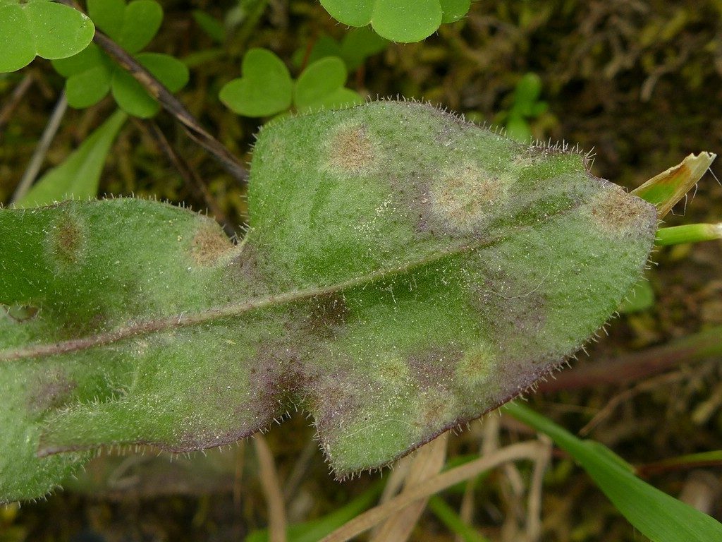 Bei einem Befall ist das Myzel der Echten Mehltaupilze bräunlich gefärbt; hier relativ auffällig (hier auf Podosphaera erigerontis-canadensis, Leontodon tuberosus)