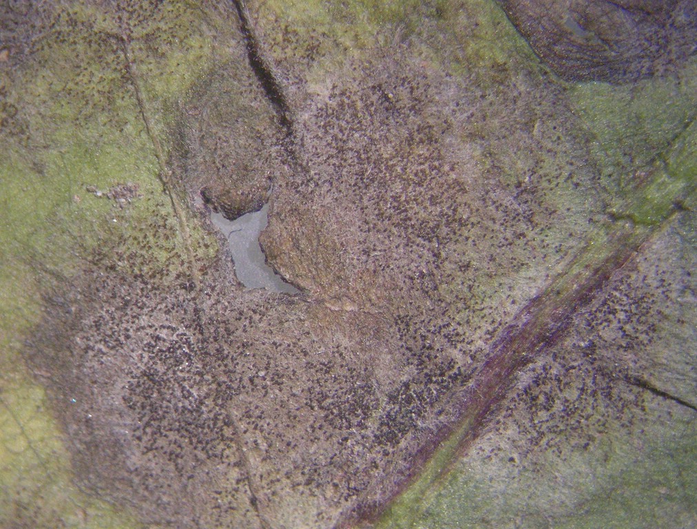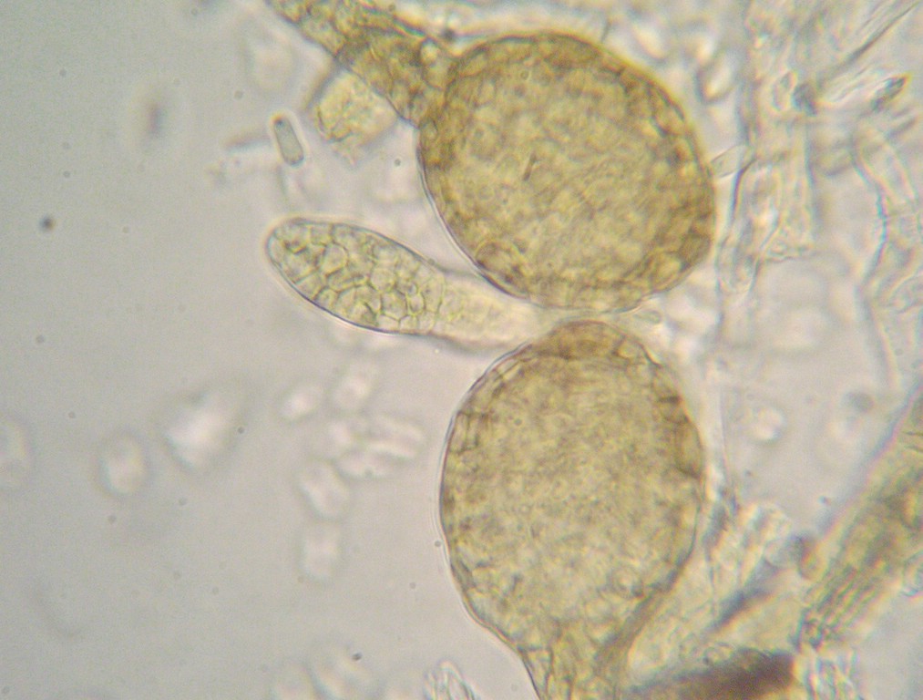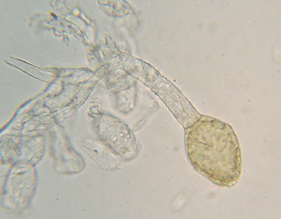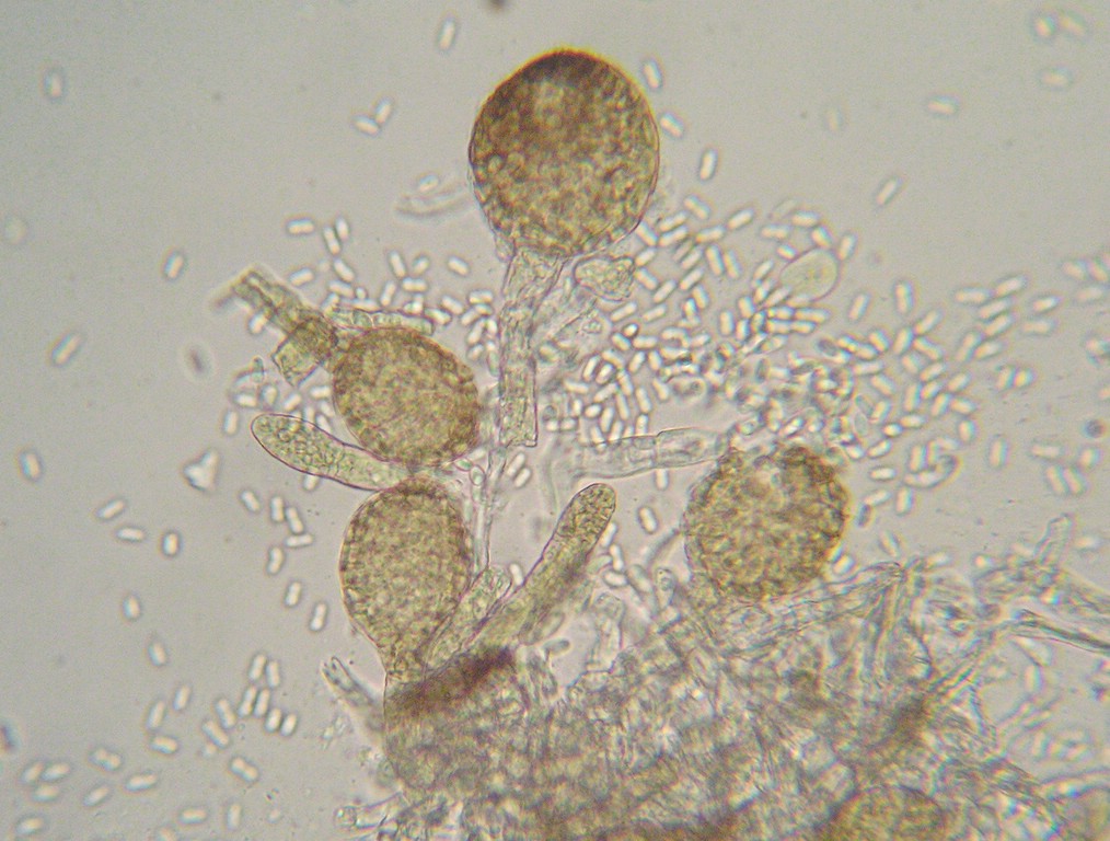 Oft sieht man die Befälle erst beim Mikroskopieren, denn das braune Myzel kann auch sehr undeutlich ausgebildet sein; typisch sind diese zitronen- bis rautenförmigen, braunen Konidienträger