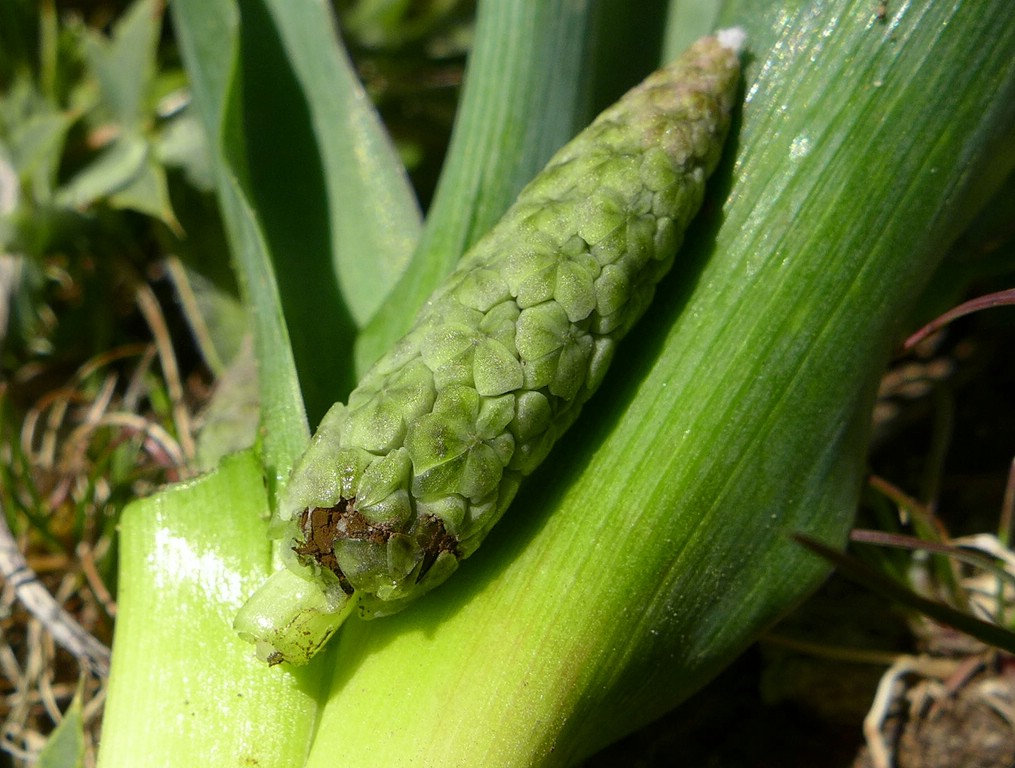 Manuell geöffnete Blüte: Man sieht das olivbraune Sporenpulver