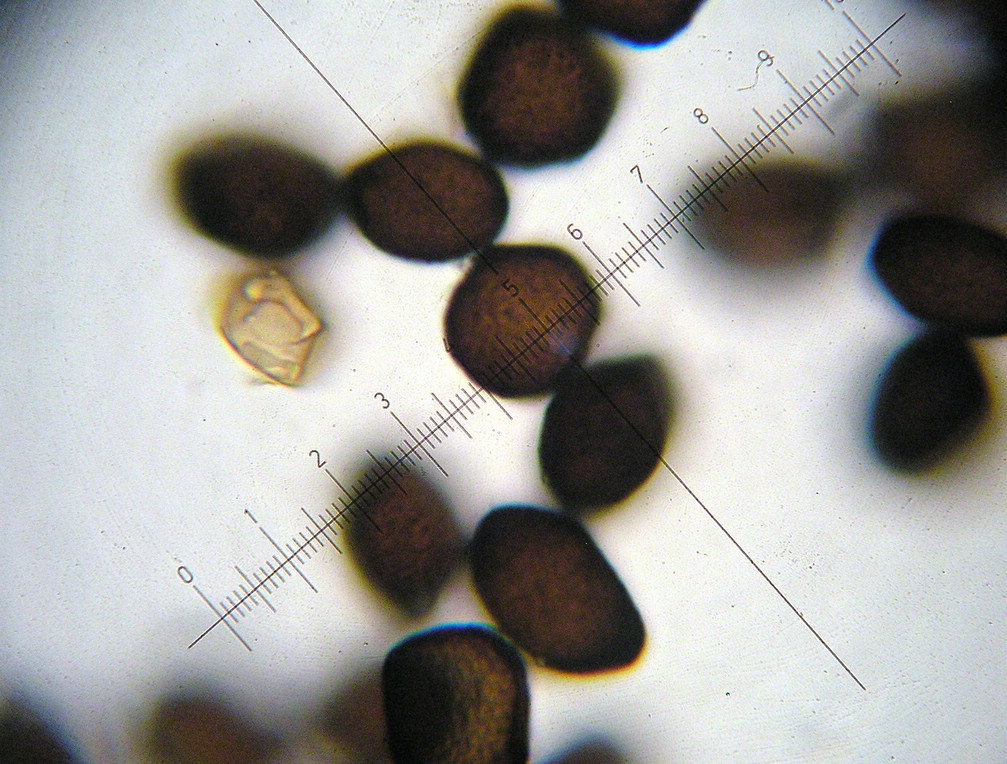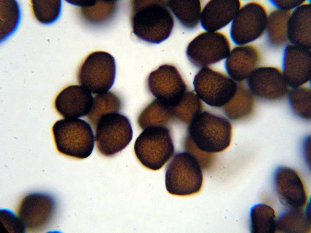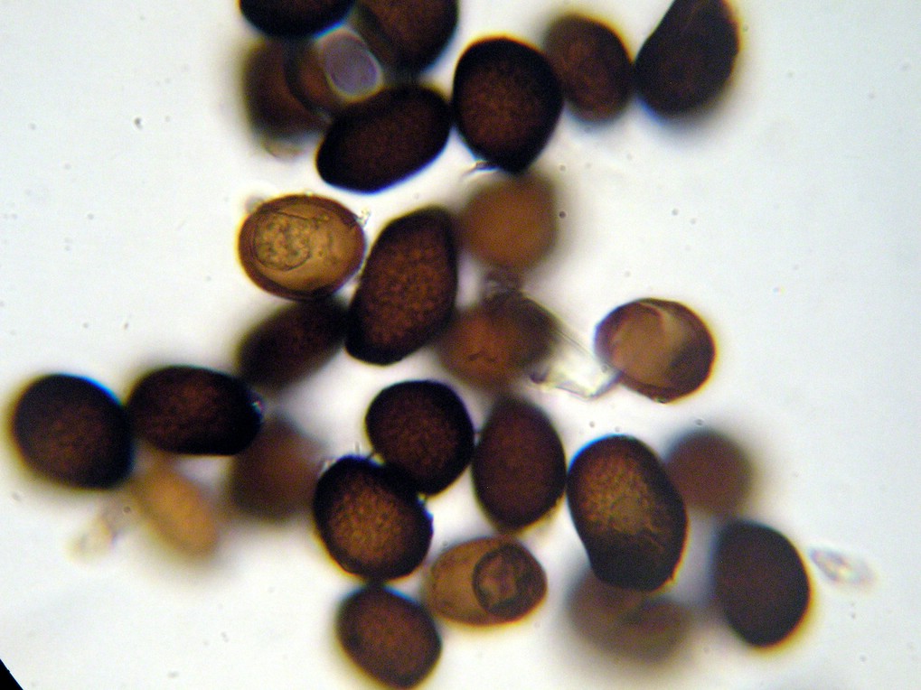 Sporen breit elliptisch bis kugelig, selten auch irregulär oder eckig, 17-19 x 15-16 µm