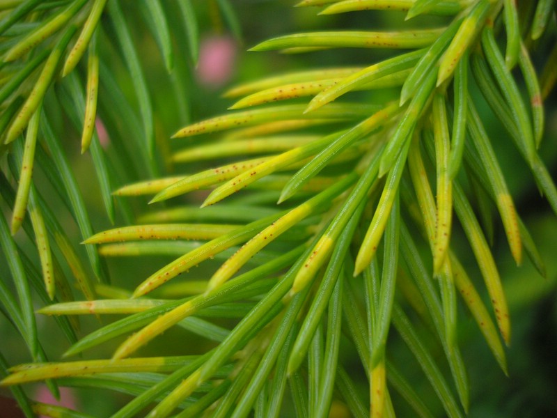 Spermogonien an gelblich verfärbten Nadeln; jung sind diese rötlich, später bräunlich