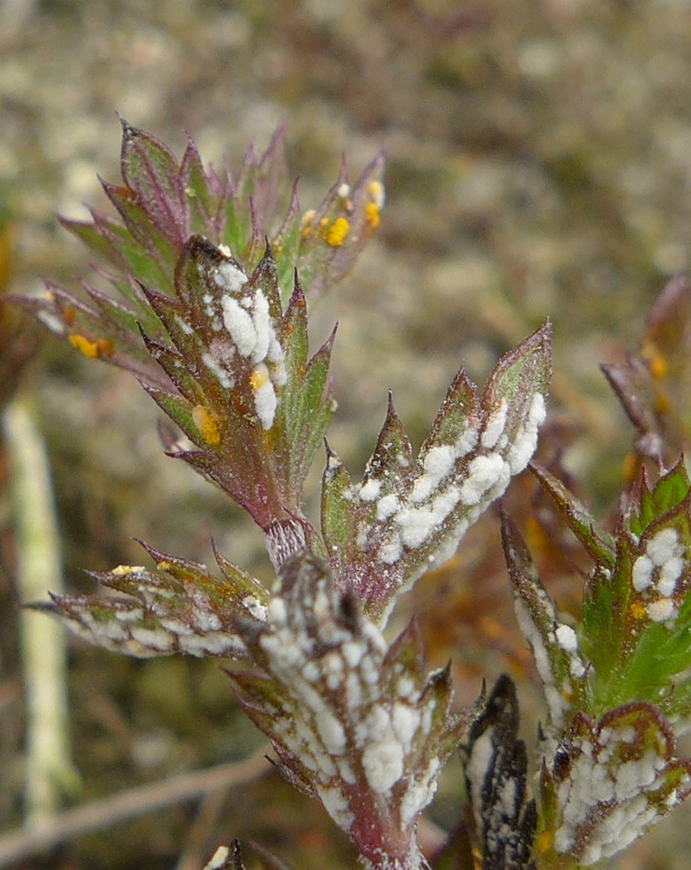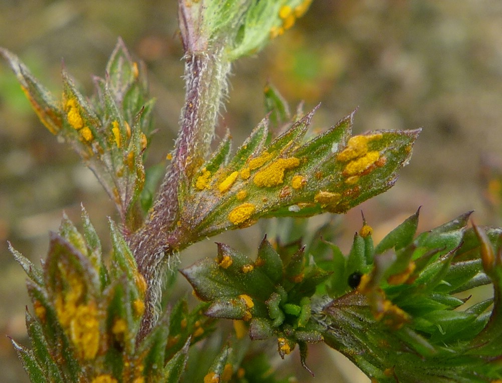 Uredien hier mit dem Hyperparasiten Ramularia coleosporii befallen