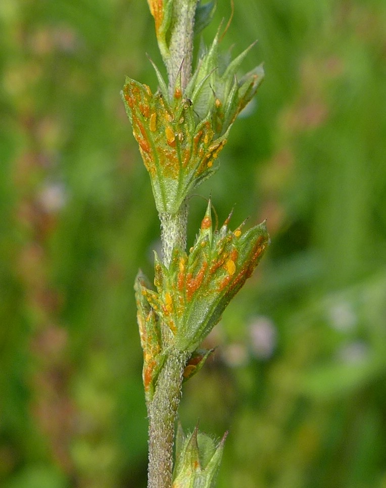Bemerkung: Dieser Rostpilz vollführt einen Wirtswechsel. Während auf Kiefer (Pinus) die Spermogonien und Aezien gebildet werden, wechselt der Pilz im Sommer auf verschiedene Vertreter der Sommerwurzgewächse, wie z. B. Rhinanthus, um dort seine Entwicklung mit der Ausbildung von Uredien und Telien zu vollenden.