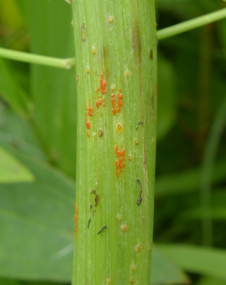 Seltener ist auch der Stängel befallen (hier orangerote, wachsartige und krustige Telien)
