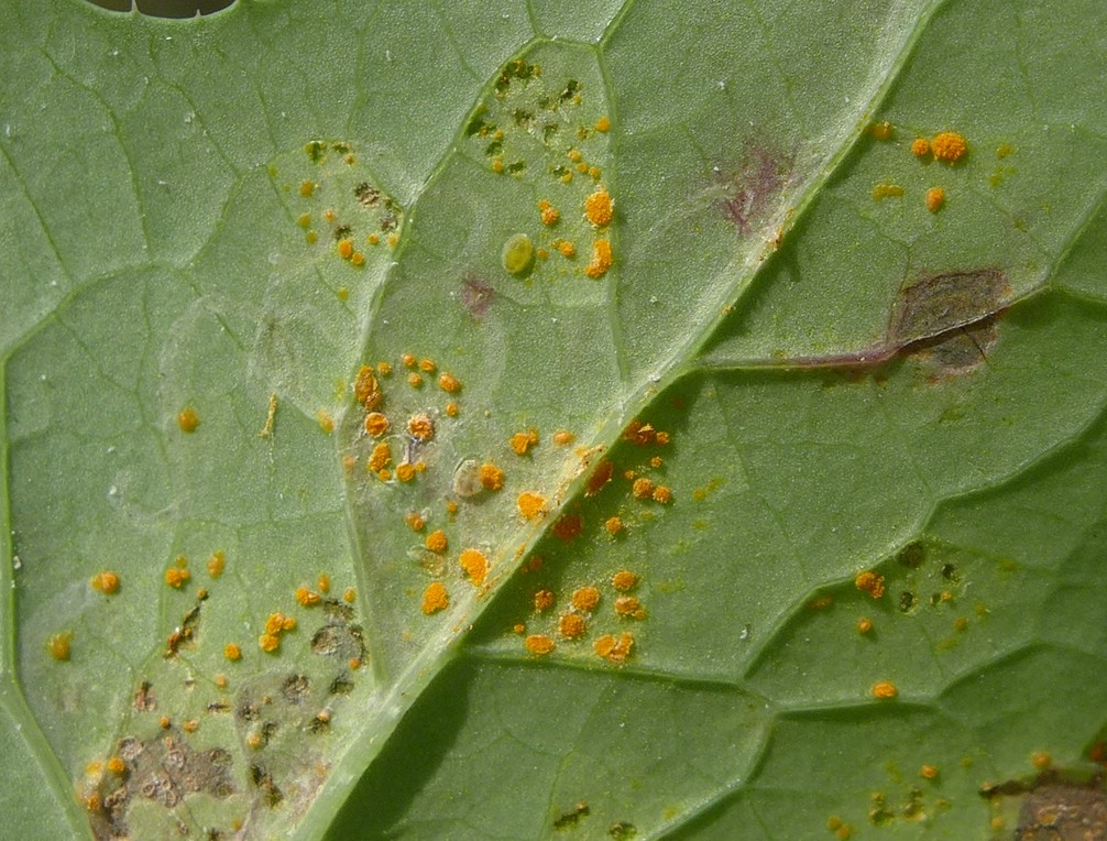 Uredien oft gruppenweise angeordnet, blattunterseits, orange, von den Resten der Epidermis umgeben