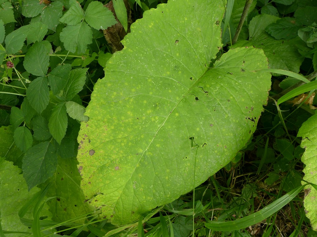 Befall blattoberseits durch jung gelbgrüne, später dunkle Fleckenbildung zu erkennen