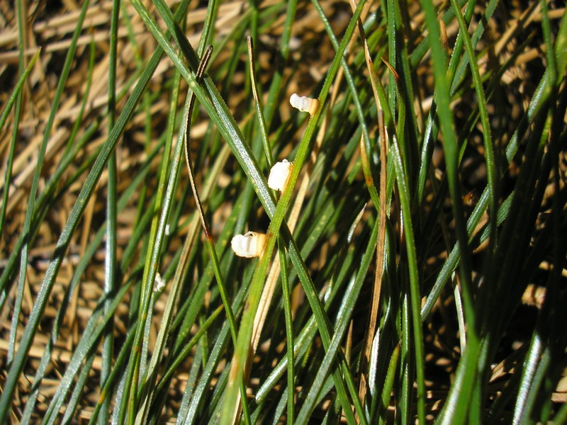 Sporenlager sind orange, werden an den Nadeln gebildet und sind mit einem sackförmigen Häutchen umgeben