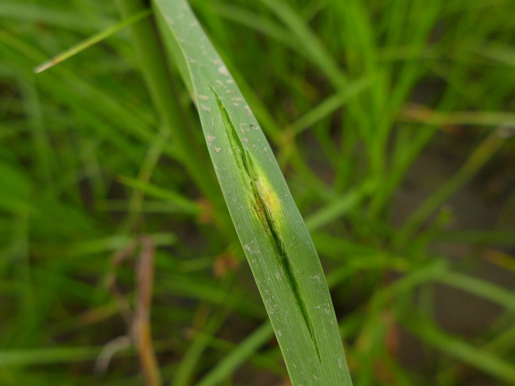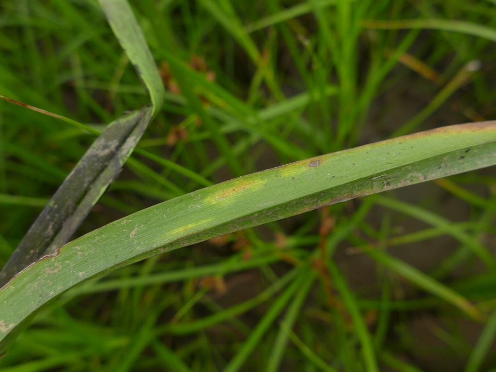Sori in Blättern und Stängeln als bleich gelbe, später blassbraune bis braune, längliche Flecken (stellenweise zusammenfließend), oft nicht deutlich abgesetzt, 0,5-2 cm