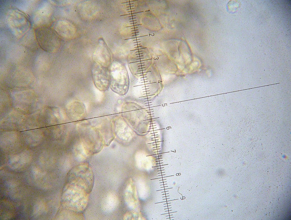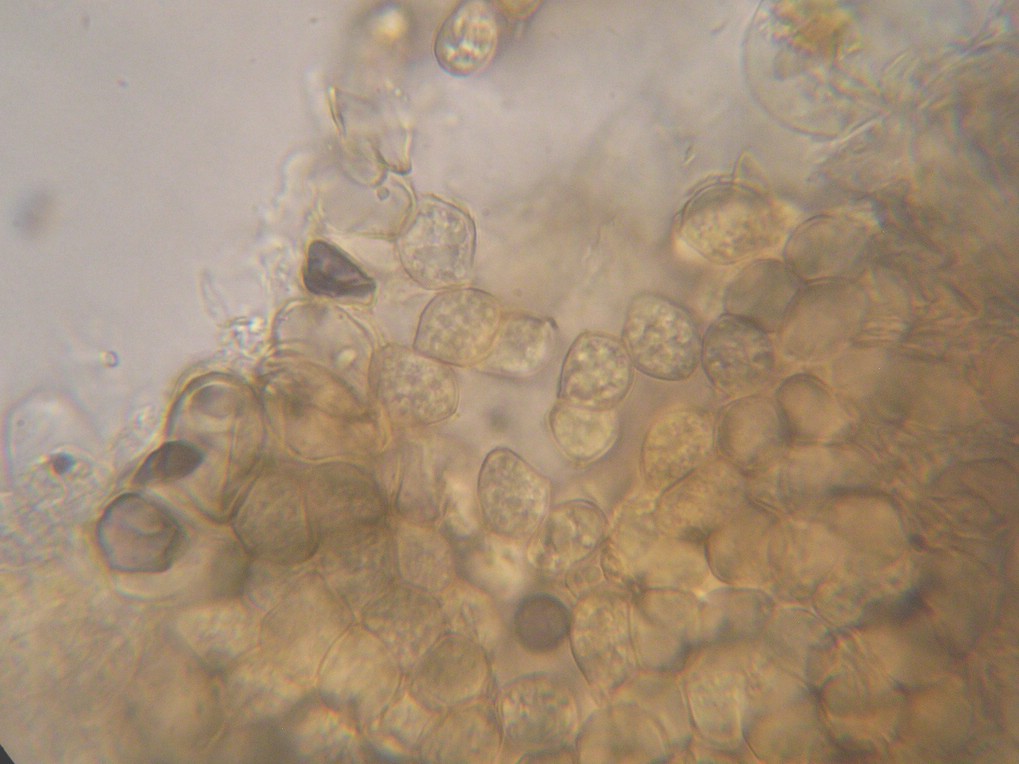 Sporen kugelig bis eiförmig oder irregulär, blass gelblich, 10-12 x 7-9 µm, Wand glatt.