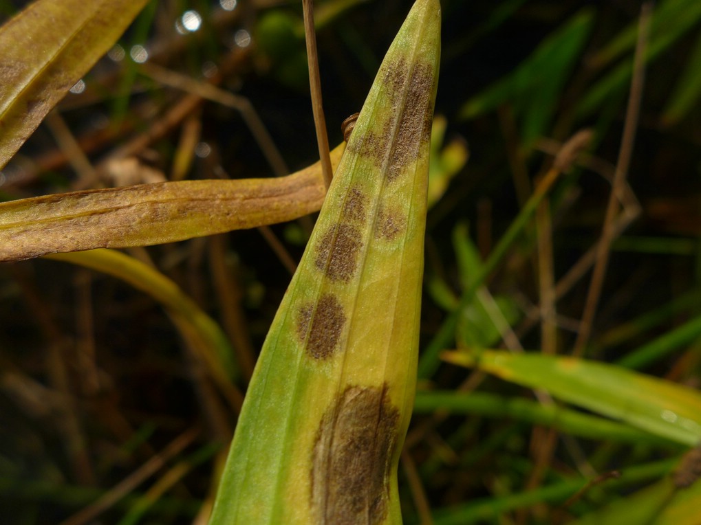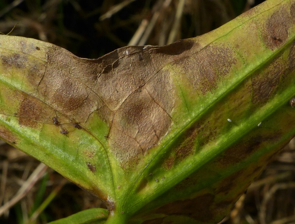 Sporenballen als zahlreiche bräunliche Punkte unterseits der Blattflecken