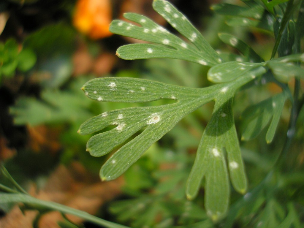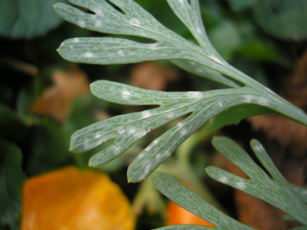 Befall auch auf der Blattunterseite als weißliche Flecken zu sehen