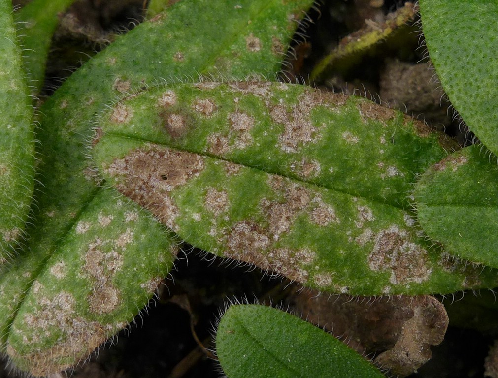 Blattflecken 1-3 mm im Durchmesser, jung weißlich, gelblichweiß oder grünlich