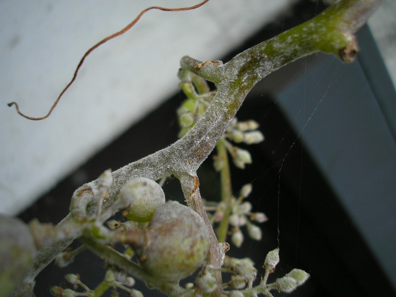 Weißes dichtes und flockiges Myzel an Stängel und Früchten