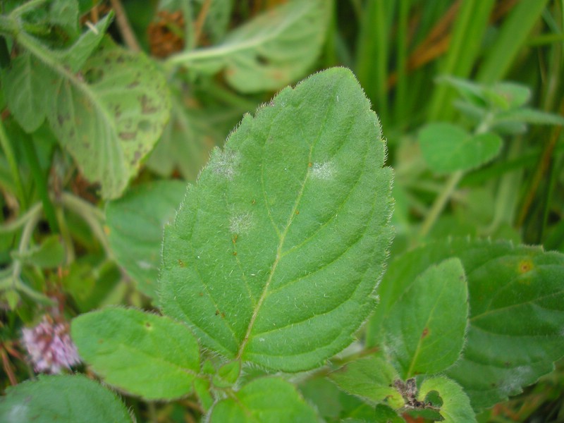 Myzel meist nur schwach als weißes Belag auf den Blättern ausgebildet