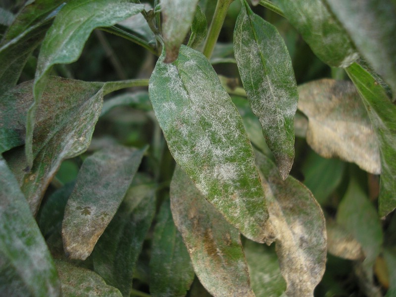 Ein weißes flockiges Myzel auf den Blättern ausgebildet