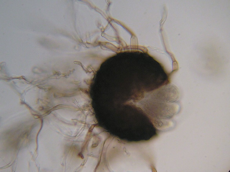 Chasmothecien 80 – 160 µm im Durchmesser, mit 10 bis 25 Asci und Anhängsel zahlreich