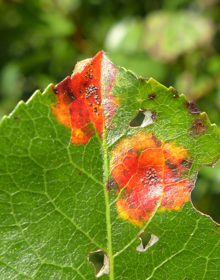 Befall auf der Oberseite durch große gelblich-rote Fleckenbildung erkennbar, Spermogonien rundlich, schwarz