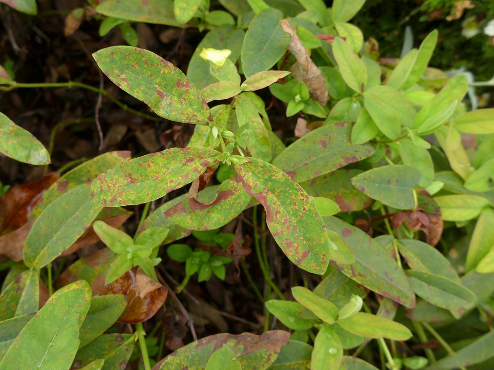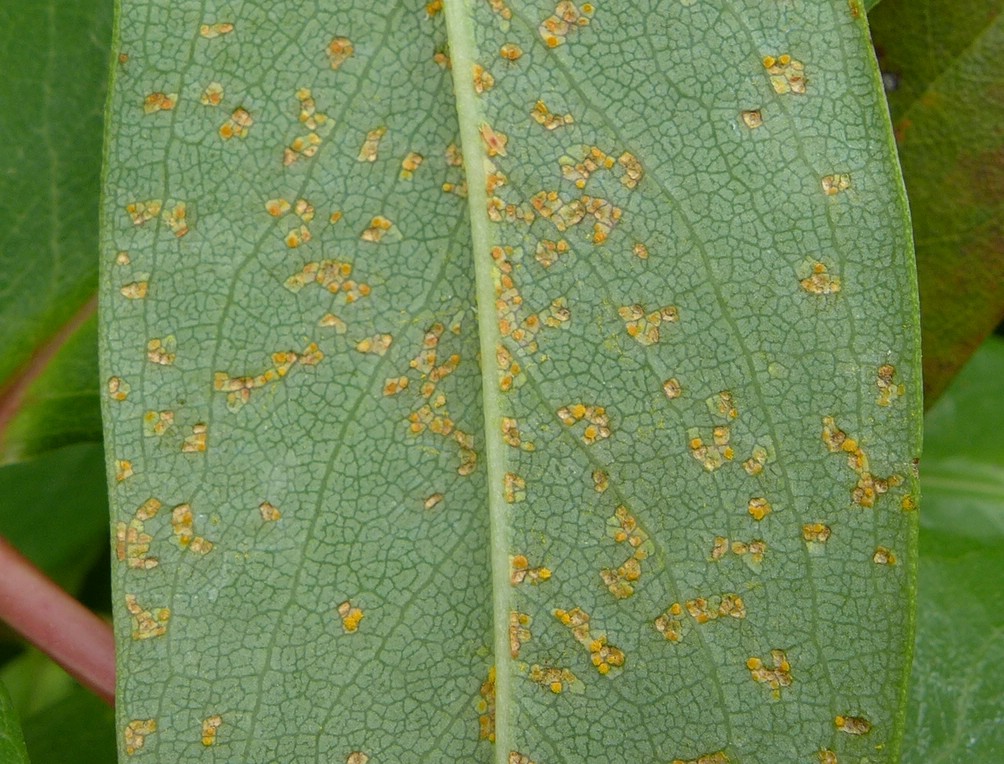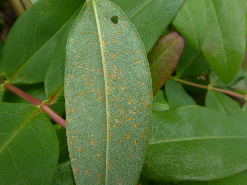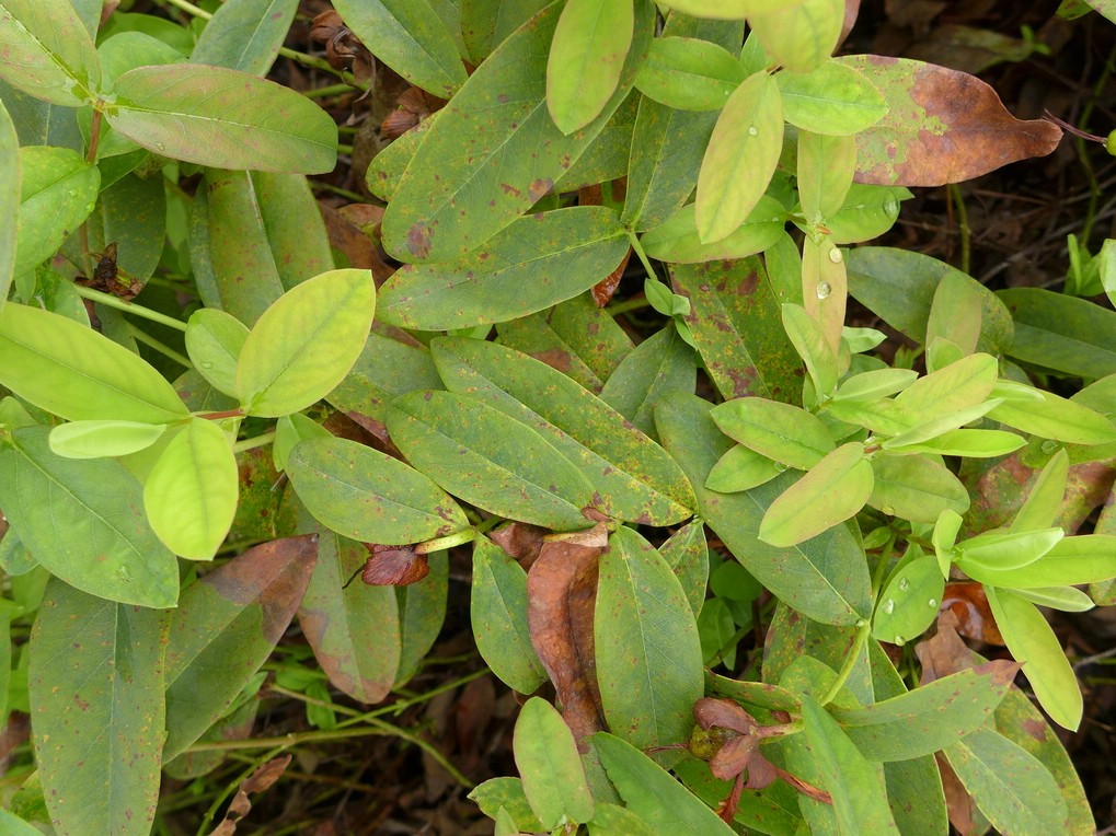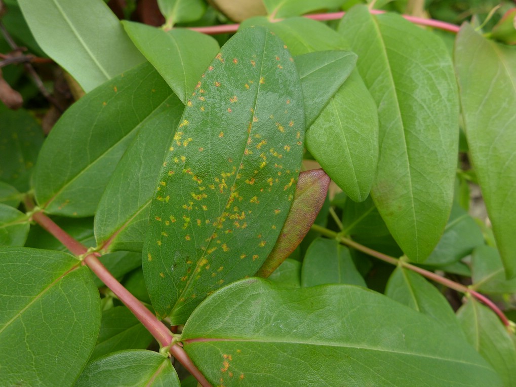 Bemerkung: Dieser Rostpilz vollführt keinen Wirtswechsel. Auf Hartheu (Hypericum) werden die Aezien, sowie die Telien ausgebildet. Letztere sieht man in Deutschland aber meist nicht. Diese Art ist vermutlich ein Neomyzet und nicht konspezifisch mit Melampsora hypericorum, welche bei uns auf wilden Hypericum-Arten vorkommt.