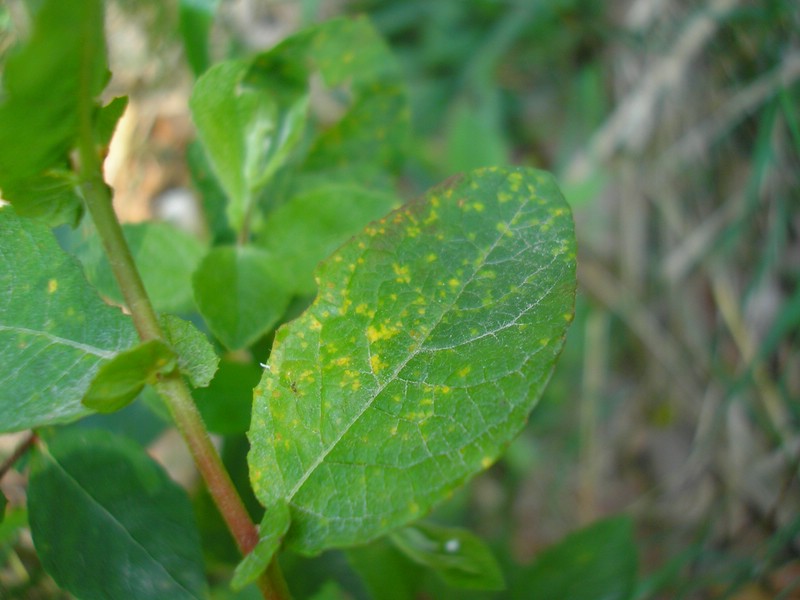 Unterseits dieser werden die orangefarbenen, früh freien Uredien gebildet