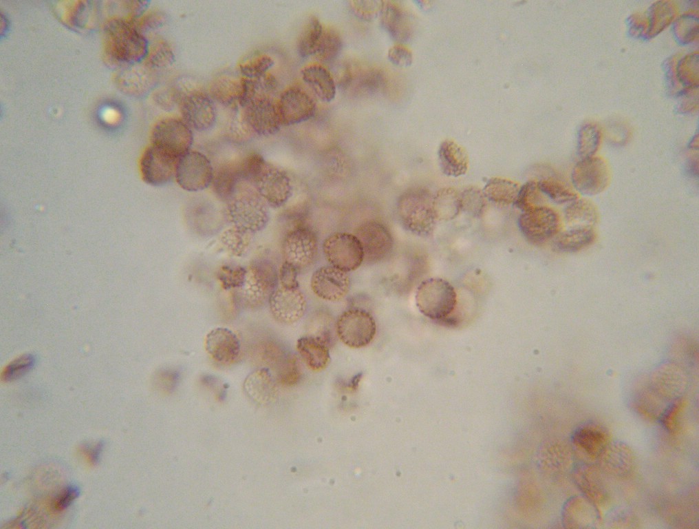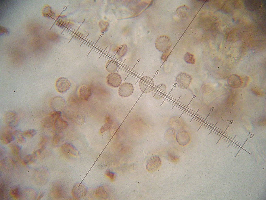 Sporen kugelig, selten ellipsoid, blass braunviolett, 6-7 x 5-6 µm