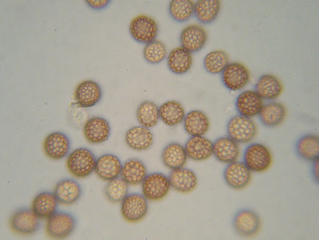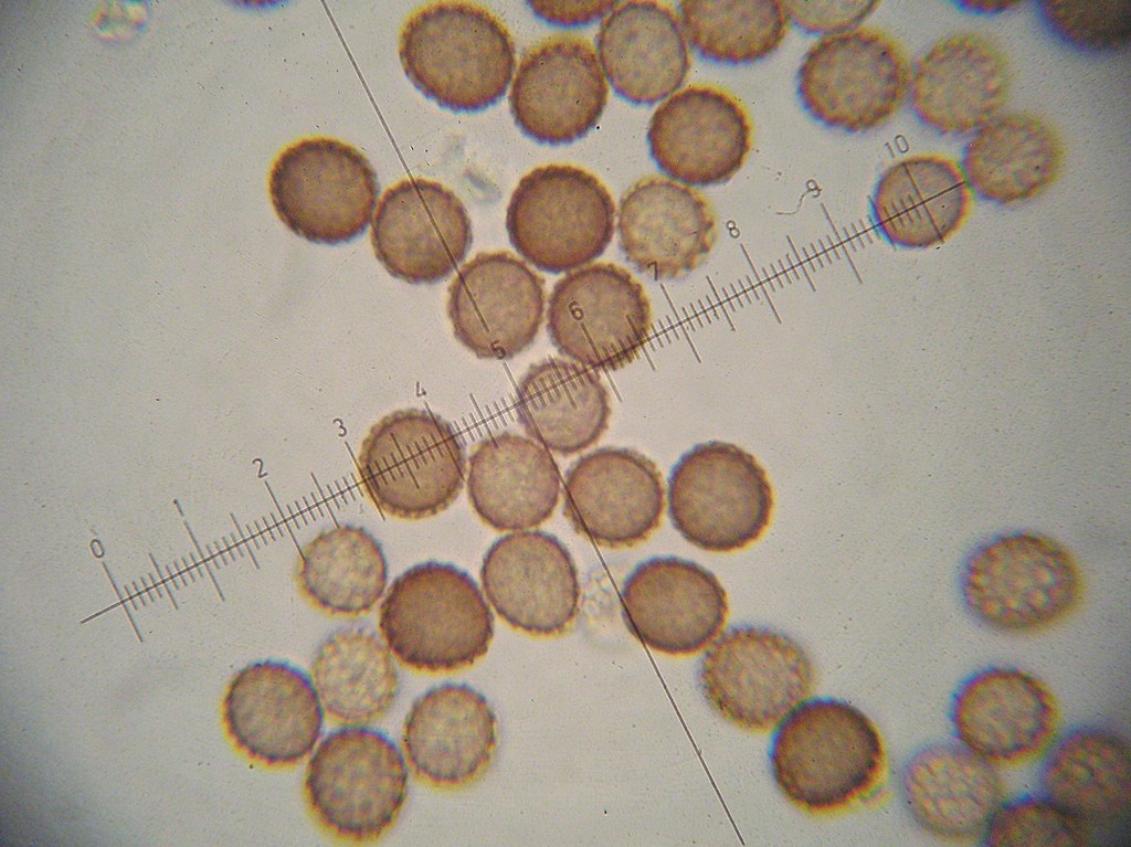 Sporen kugelig, selten ellipsoid, blass braunviolett, 10-11 x 9-10 µm