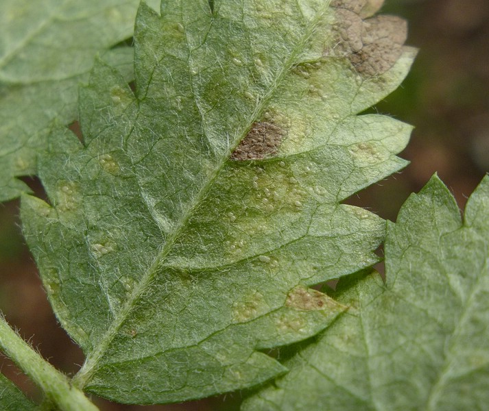 Uredolager werden blattunterseits von blassgelblichen bis grünlichen Blattflecken gebildet