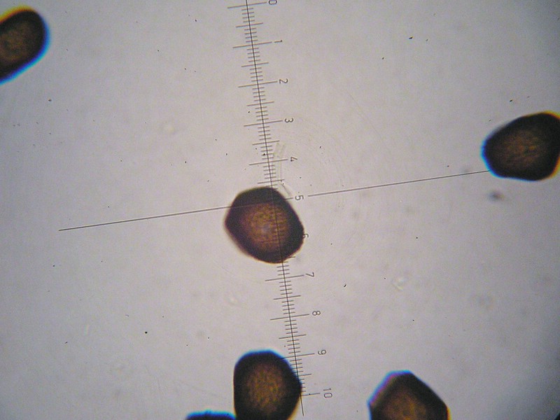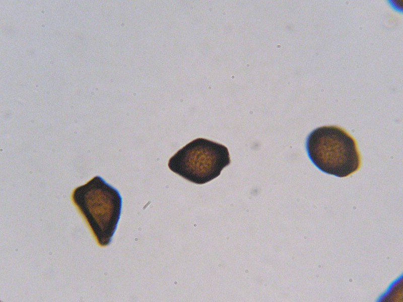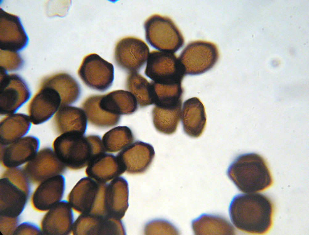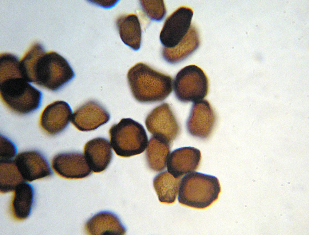 Sporen breit elliptisch, stellenweise auch irregulär oder eckig, oft mit Auswüchsen an den verlängerten Enden der Sporen.