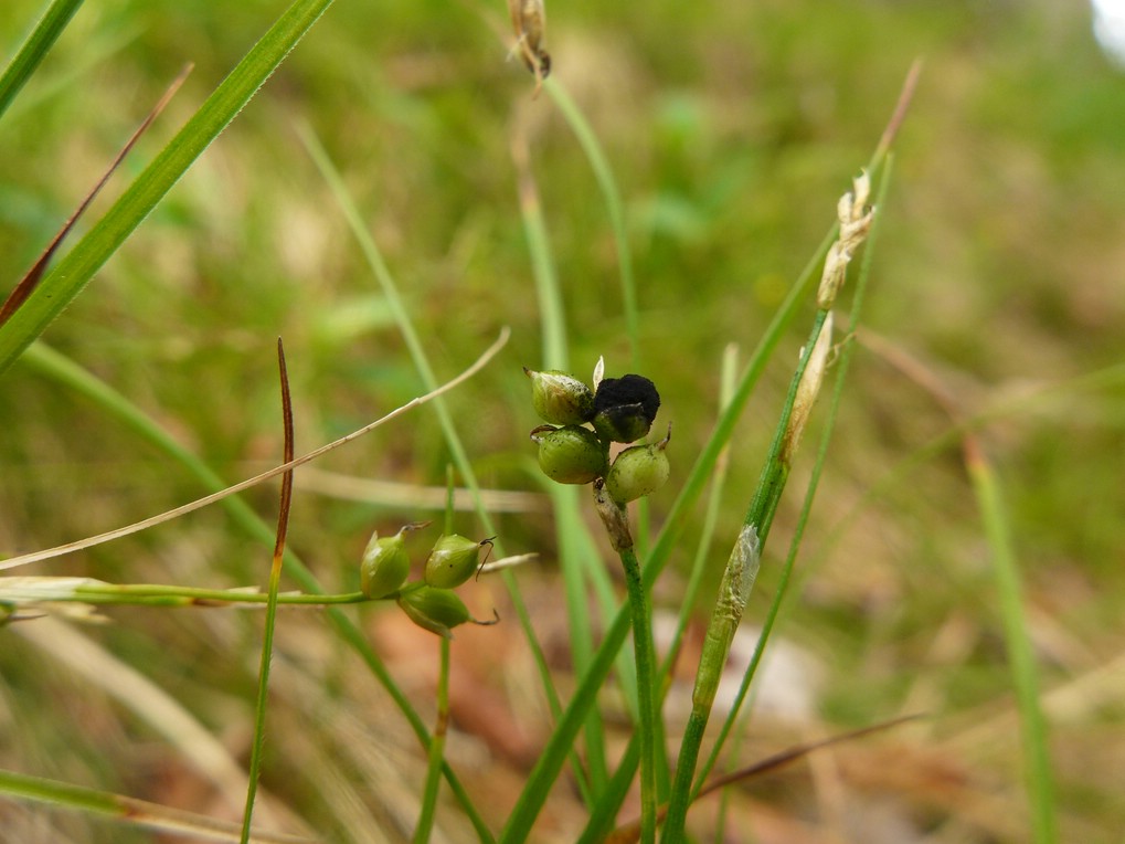 Sori in den Blüten; als schwarze, feste Brandkörper (ca. 1-2 mm im Durchmesser) um die Fruchtknoten