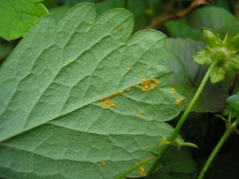 Unterseits von gelblichen bis rötlichen Blattflecken werden die Pilzlager gebildet