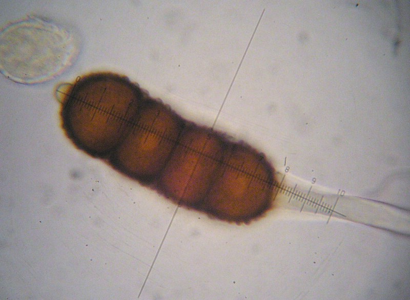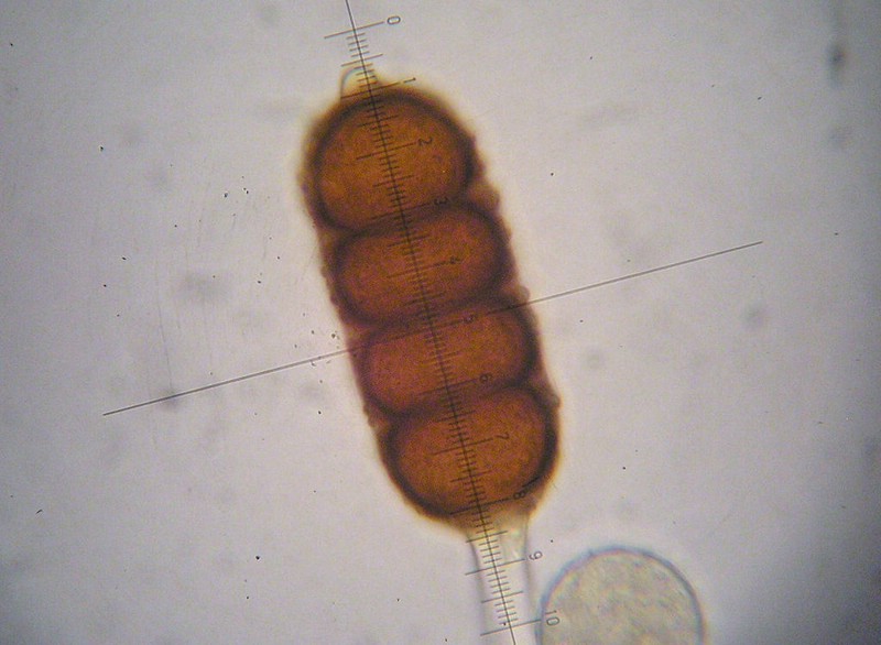 Teliosporen am Scheitel mit einer gerundeten, gelblichen Papille