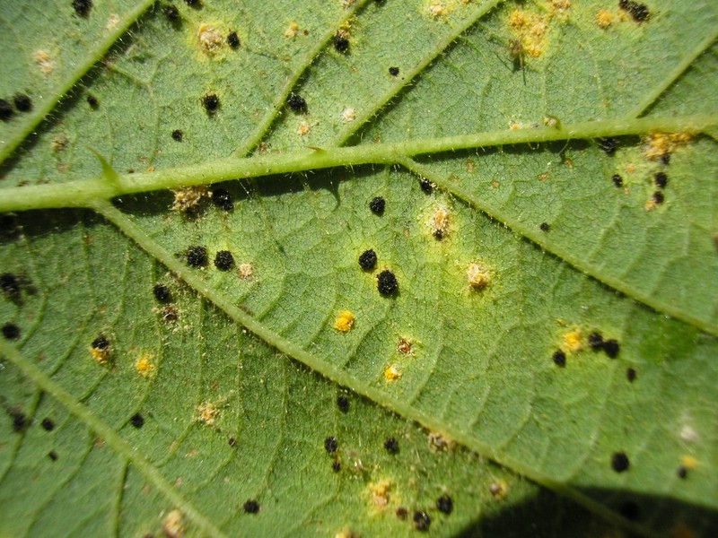 Die Pilzlager werden unterseits von violetten, rundlichen Flecken gebildet