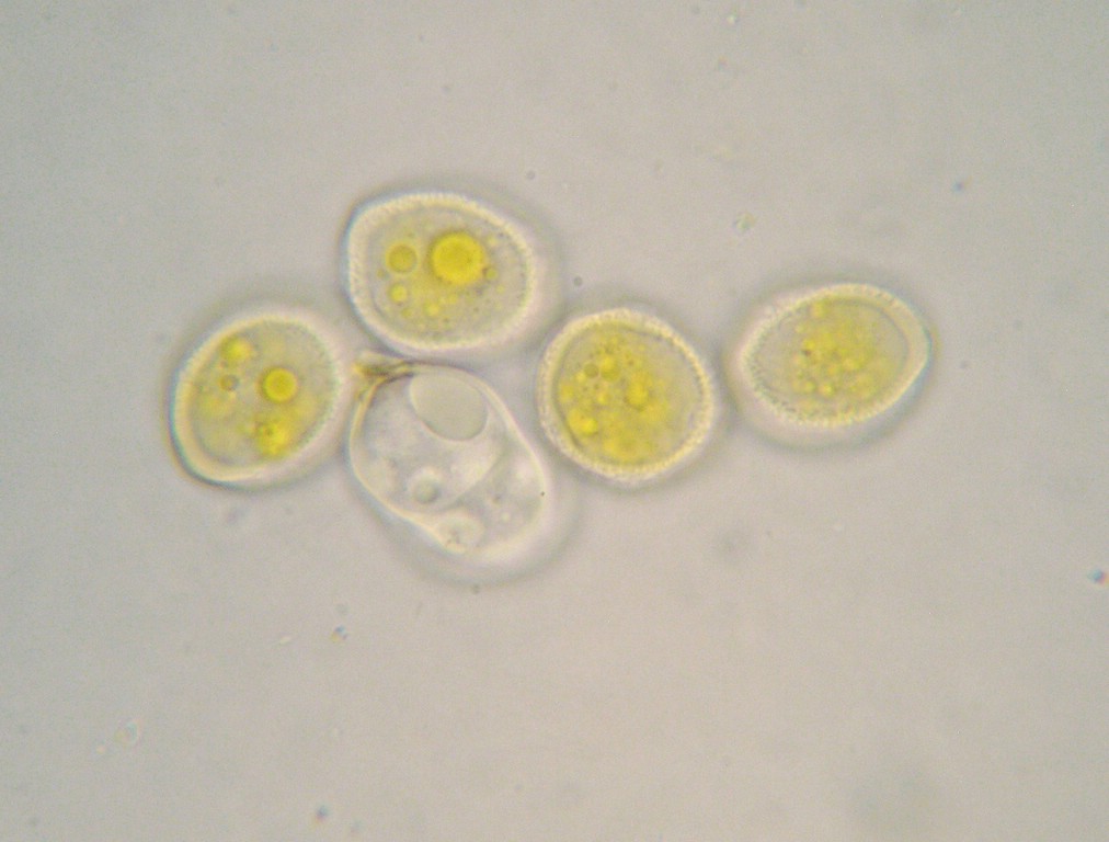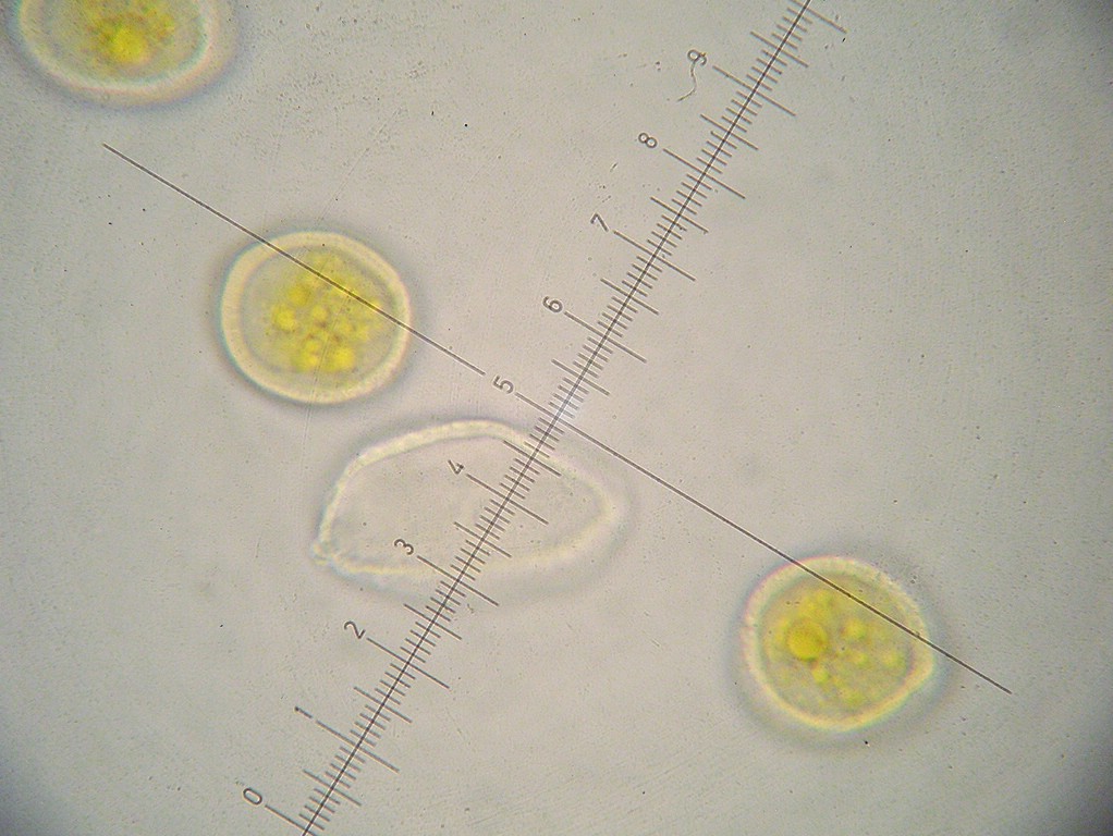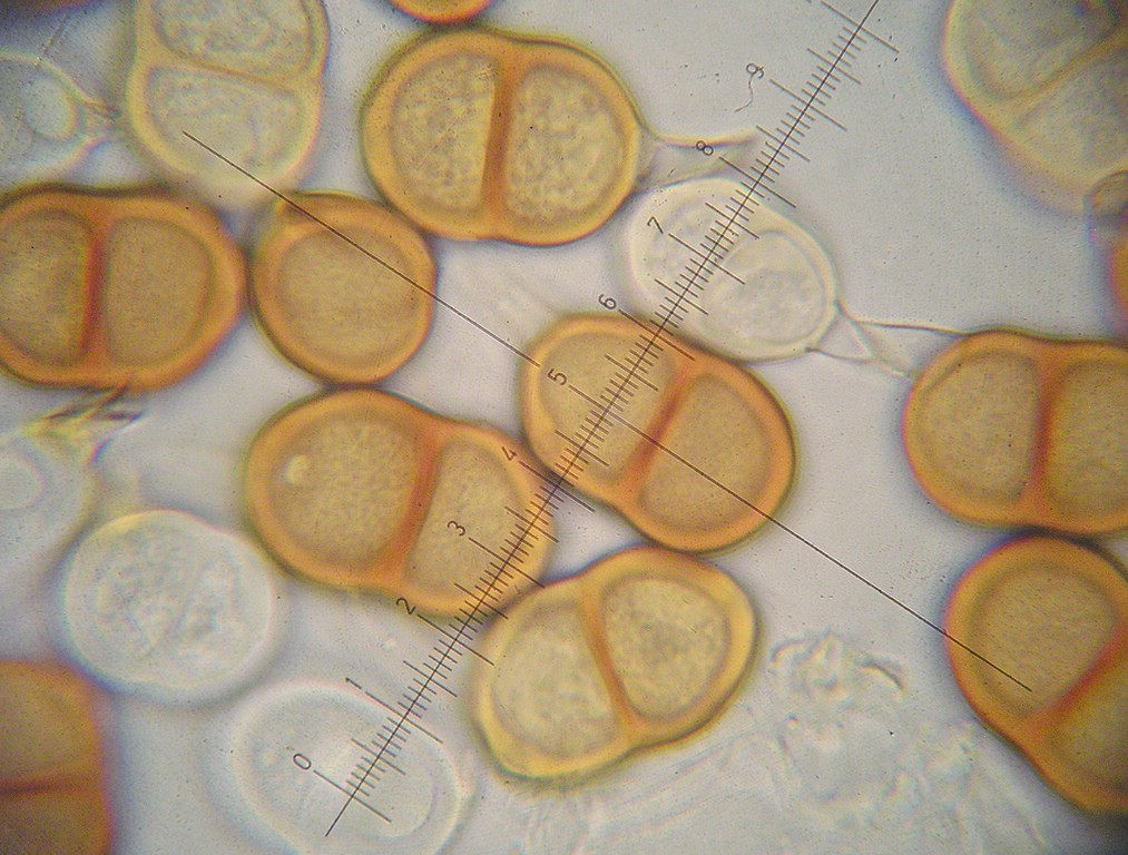 Uredosporen kugelig bis ellipsoid, blass gelbbraun, 19-21 x 17-19 µm