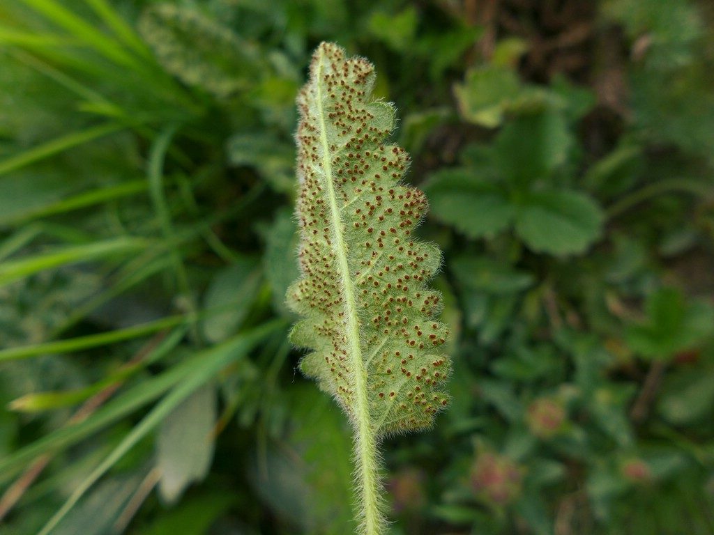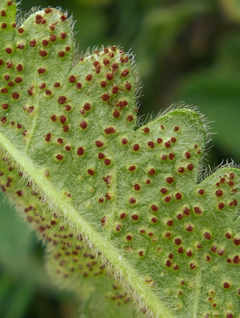 Telien meist auf der gesamten Blattunterseite zerstreut, rundlich, zimtbraun, früh nackt (=stäubend)