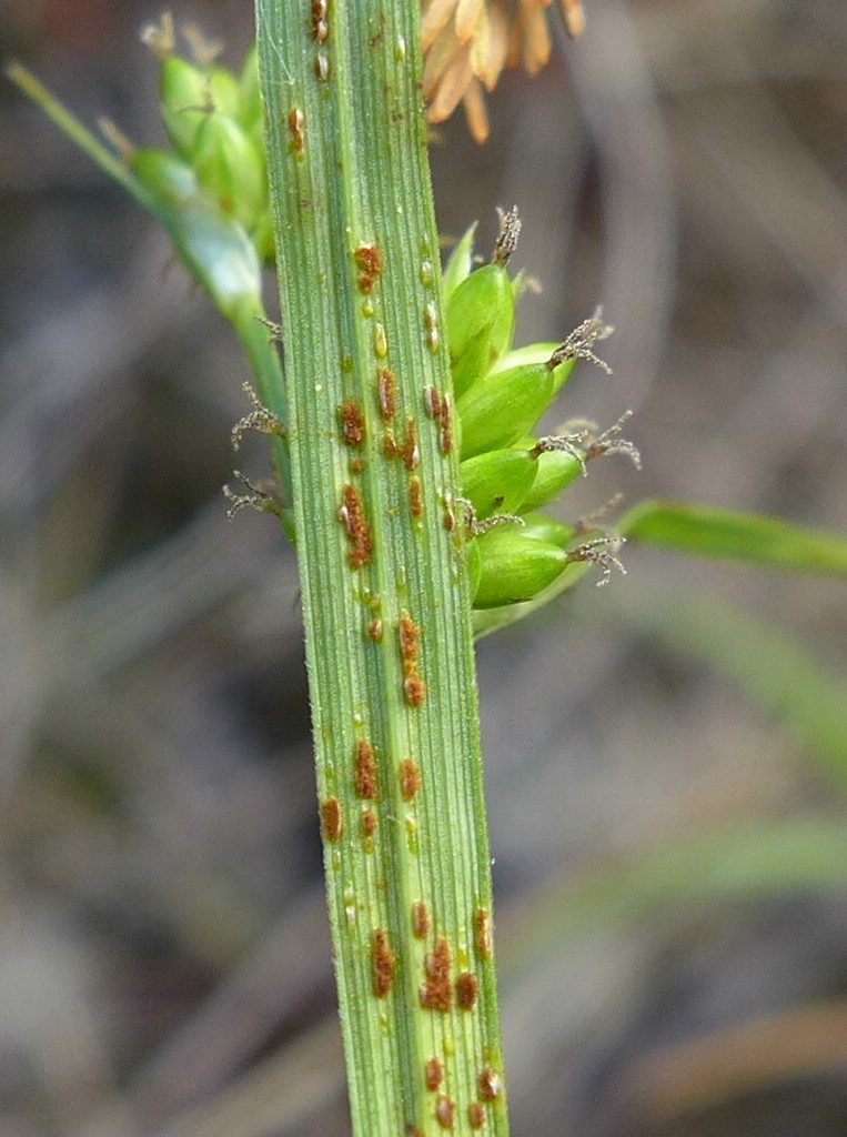Bemerkung: Dieser Rostpilz vollführt einen Wirtswechsel. Auf verschiedenen Korbblütlern werden im Frühjahr die Spermogonien und Aezien gebildet und im Sommer wechselt der Pilz dann zur Bleichen Segge um mit der Ausbildung von Uredien und Telien seine Entwicklung zu vollenden.