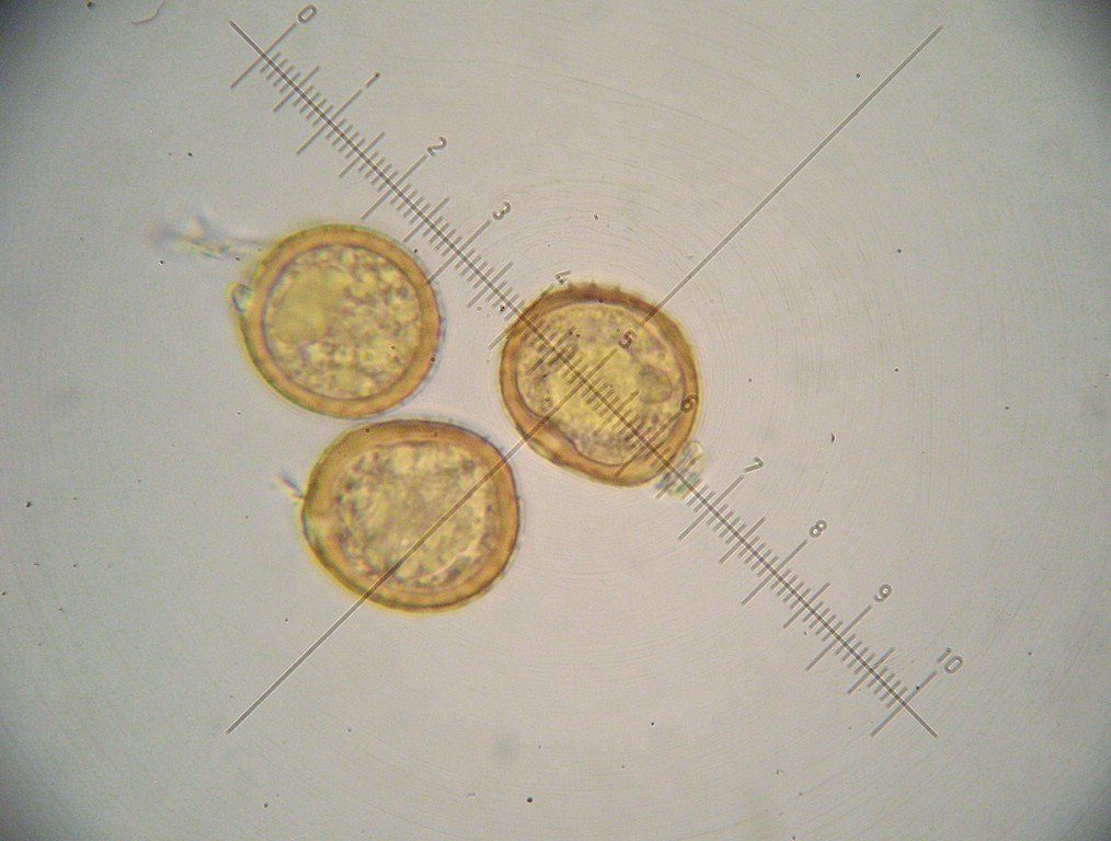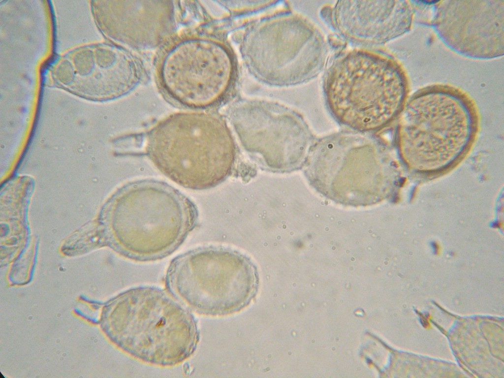 Uredosporen mit zwei äquatorial gelegenen Keimporen (helle Kreise)