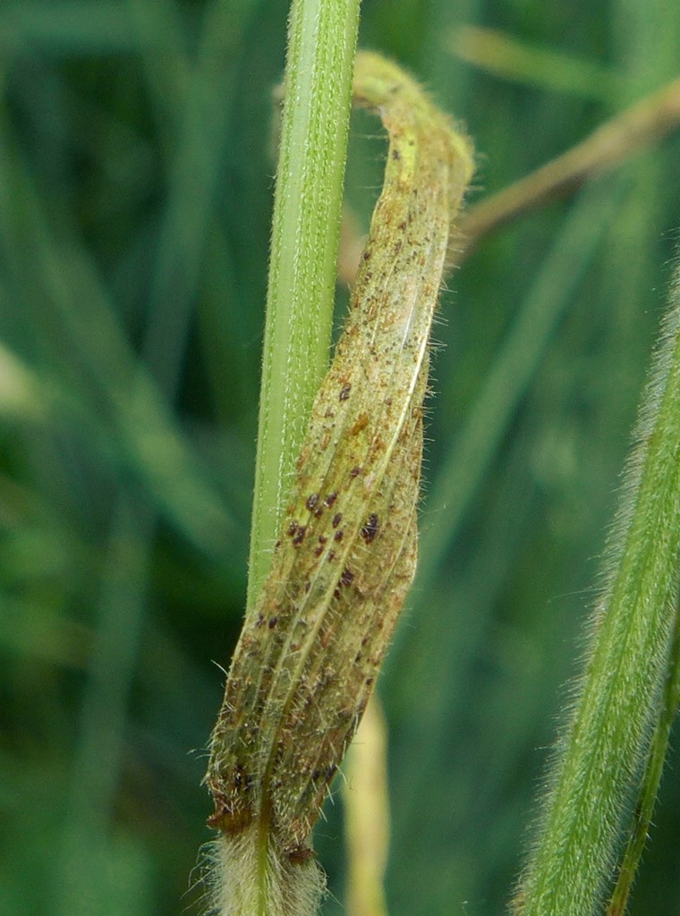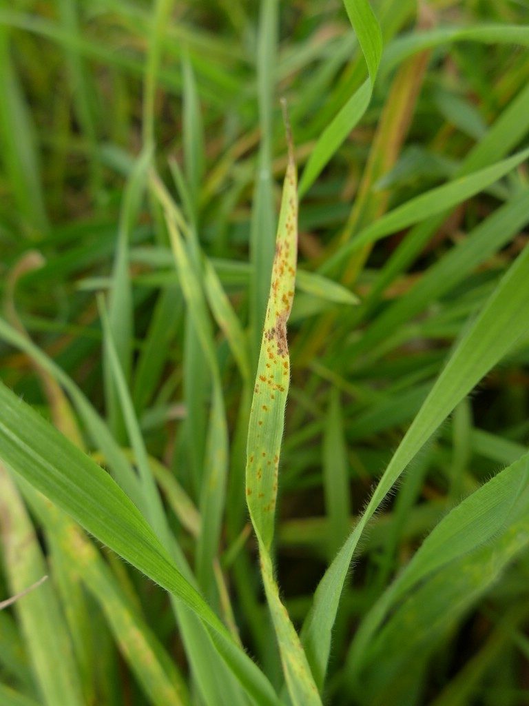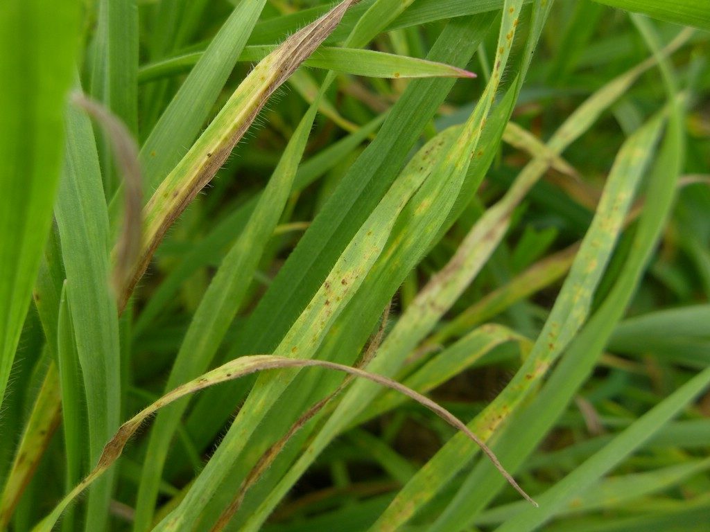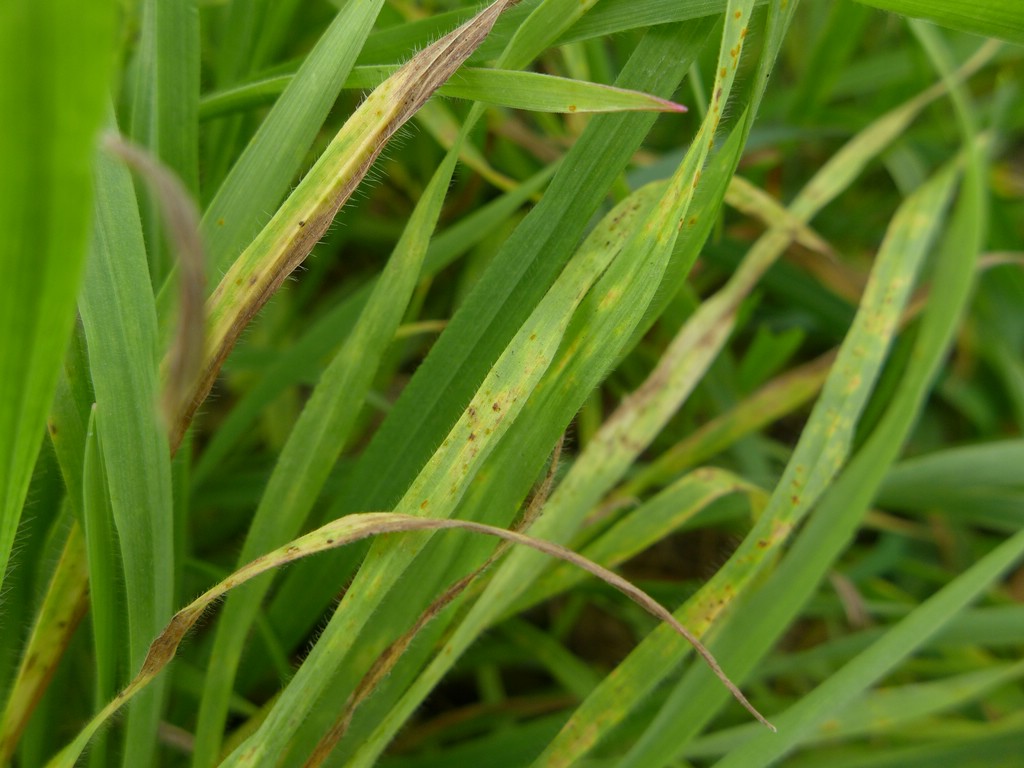 Pilzlager auf beiden Blattseiten von gelben, rötlichen oder braunen länglichen und zahlreichen Blattflecken