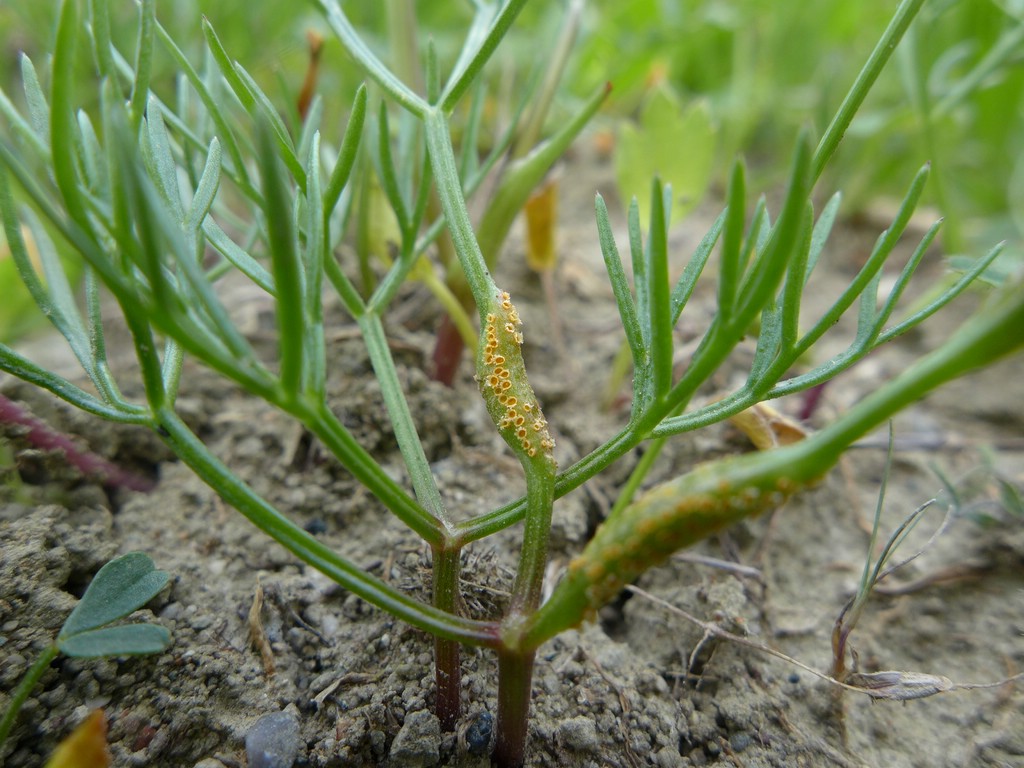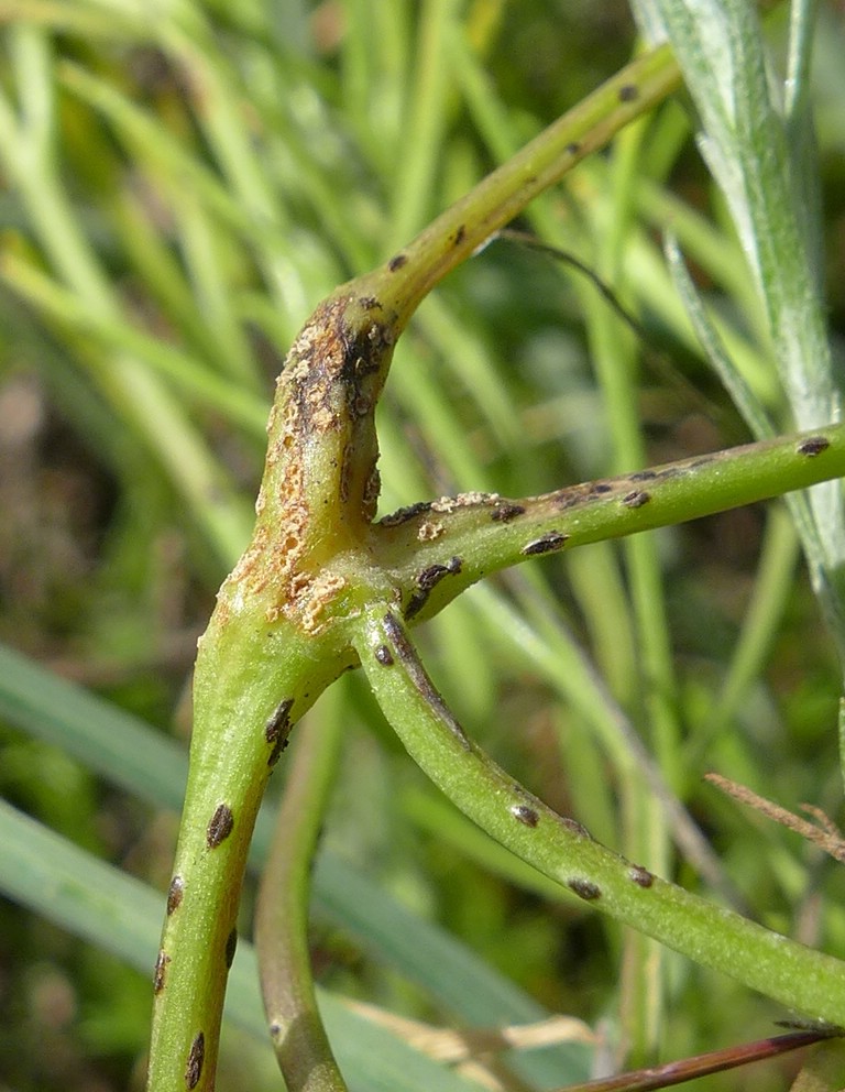 Aezien vor allem an jungen Stängeln und Blattstielen; dort auf gelbliche bis rotvioletten Anschwellungen sitzend