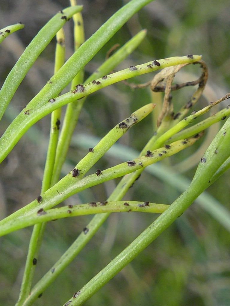 Bemerkung: Dieser Rostpilz vollführt keinen Wirtswechsel. Er verkürzt seine Entwicklung auf die Ausbildung von Spermogonien, Aezien und Telien.